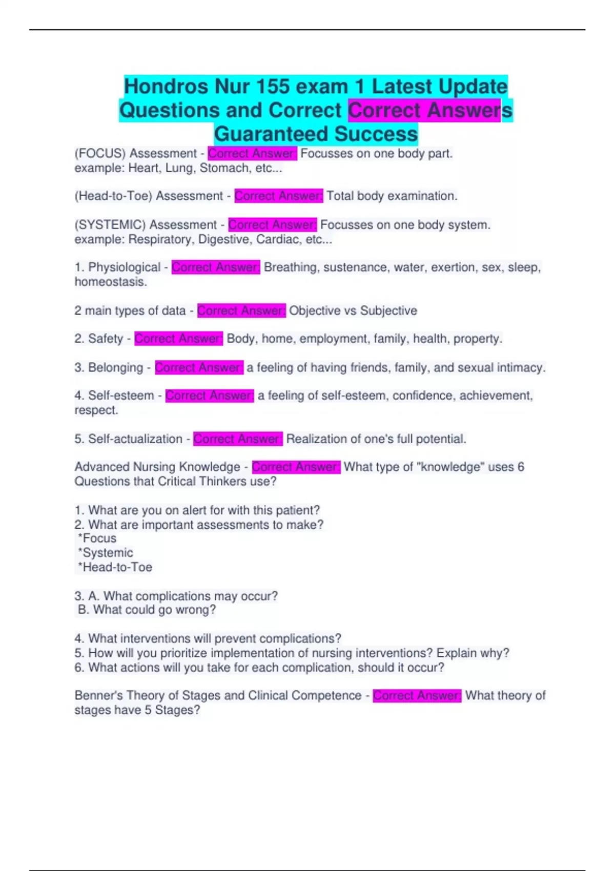 Hondros Nur 155 exam 1 Latest Update Questions and Correct Answers Guaranteed Success