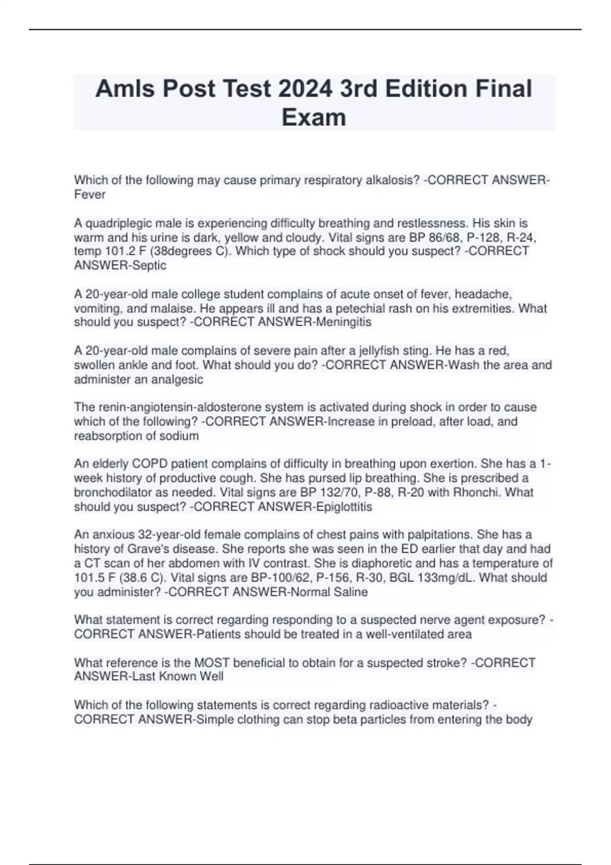 Amls Post Test 2024 3rd Edition Final Exam Which of the following may cause primary respiratory alkalosis? -CORRECT ANSWERFever A quadriplegic male is experiencing difficulty breathing and restlessness. His skin is warm and his urine is dark, yellow and cloudy. Vital signs are BP 86/68, P-128, R-24, temp 101.2 F (38degrees C). Which type of shock should you suspect? -CORRECT ANSWER-Septic A 20-year-old male college student complains of acute onset of fever, headache, vomiting, and malaise. He appears ill and has a petechial rash on his extremities. What should you suspect? -CORRECT ANSWER-Meningitis A 20-year-old male complains of severe pain after a jellyfish sting. He has a red, swollen ankle and foot. What should you do? -CORRECT ANSWER-Wash the area and administer an analgesic The renin-angiotensin-aldosterone system is activated during shock in order to cause which of the following? -CORRECT ANSWER-Increase in preload, after load, and reabsorption of sodium An elderly COPD patient complains of difficulty in breathing upon exertion. She has a 1- week history of productive cough. She has pursed lip breathing. She is prescribed a bronchodilator as needed. Vital signs are BP 132/70, P-88, R-20 with Rhonchi. What should you suspect? -CORRECT ANSWER-Epiglottitis An anxious 32-year-old female complains of chest pains with palpitations. She has a history of Grave's disease. She reports she was seen in the ED earlier that day and had a CT scan of her abdomen with IV contrast. She is diaphoretic and has a temperature of 101.5 F (38.6 C). Vital signs are BP-100/62, P-156, R-30, BGL 133mg/dL. What should you administer? -CORRECT ANSWER-Normal Saline What statement is correct regarding responding to a suspected nerve agent exposure? - CORRECT ANSWER-Patients should be treated in a well-ventilated area What reference is the MOST beneficial to obtain for a suspected stroke? -CORRECT ANSWER-Last Known Well Which of the following statements is correct regarding radioactive materials? - CORRECT ANSWER-Simple clothing can stop beta particles from entering the body