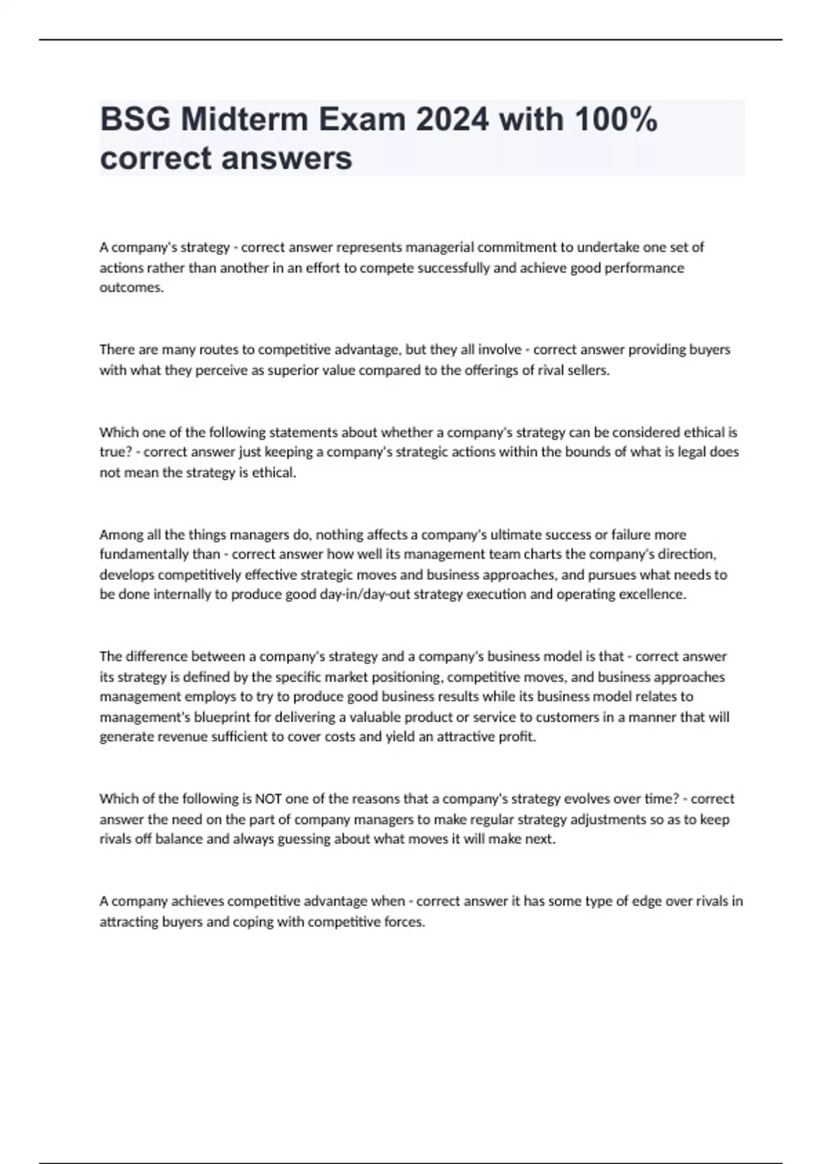 A company's strategy - correct answer represents managerial commitment to undertake one set of actions rather than another in an effort to compete successfully and achieve good performance outcomes. There are many routes to competitive advantage, but they all involve - correct answer providing buyers with what they perceive as superior value compared to the offerings of rival sellers. Which one of the following statements about whether a company's strategy can be considered ethical is true? - correct answer just keeping a company's strategic actions within the bounds of what is legal does not mean the strategy is ethical. Among all the things managers do, nothing affects a company's ultimate success or failure more fundamentally than - correct answer how well its management team charts the company's direction, develops competitively effective strategic moves and business approaches, and pursues what needs to be done internally to produce good day-in/day-out strategy execution and operating excellence. The difference between a company's strategy and a company's business model is that - correct answer its strategy is defined by the specific market positioning, competitive moves, and business approaches management employs to try to produce good business results while its business model relates to management's blueprint for delivering a valuable product or service to customers in a manner that will generate revenue sufficient to cover costs and yield an attractive profit. Which of the following is NOT one of the reasons that a company's strategy evolves over time? - correct answer the need on the part of company managers to make regular strategy adjustments so as to keep rivals off balance and always guessing about what moves it will make next. A company achieves competitive advantage when - correct answer it has some type of edge over rivals in attracting buyers and coping with competitive forces. Which one of the following does NOT account for why a company's strategy evolves over time, as shown in Figure 1.2 and explained in the accompanying text discussion? - correct answer managerial preferences for keeping the life-cycle of any given strategy short. In choosing among strategy alternatives, company managers - correct answer are well-advised to embrace strategic actions that can pass the test of moral scrutiny -- it is not enough to just stay within the bounds of what is legal and is in compliance with prevailing government regulations.