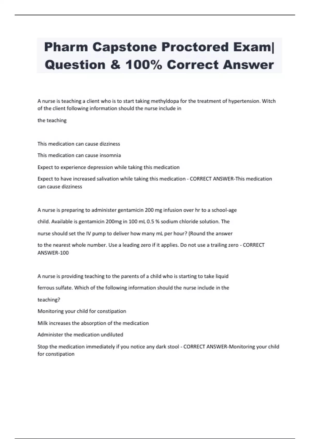 Pharm Capstone Proctored Exam| Question & 100% Correct Answer A nurse is teaching a client who is to start taking methyldopa for the treatment of hypertension. Witch of the client following information should the nurse include in the teaching This medication can cause dizziness This medication can cause insomnia Expect to experience depression while taking this medication Expect to have increased salivation while taking this medication - CORRECT ANSWER-This medication can cause dizziness A nurse is preparing to administer gentamicin 200 mg infusion over hr to a school-age child. Available is gentamicin 200mg in 100 mL 0.5 % sodium chloride solution. The nurse should set the IV pump to deliver how many mL per hour? (Round the answer to the nearest whole number. Use a leading zero if it applies. Do not use a trailing zero - CORRECT ANSWER-100