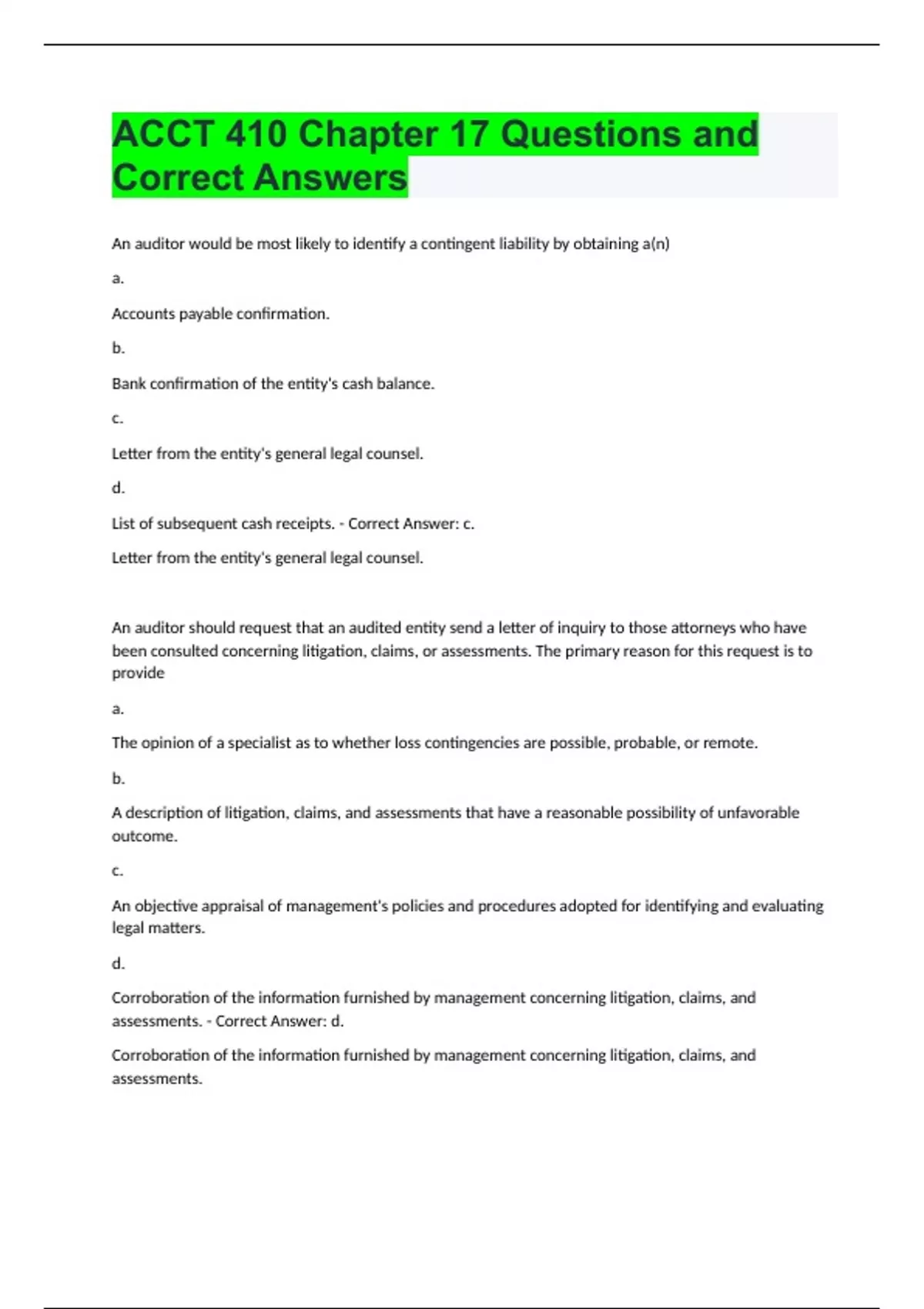 ACCT 410 Chapter 17 Questions and Correct Answer