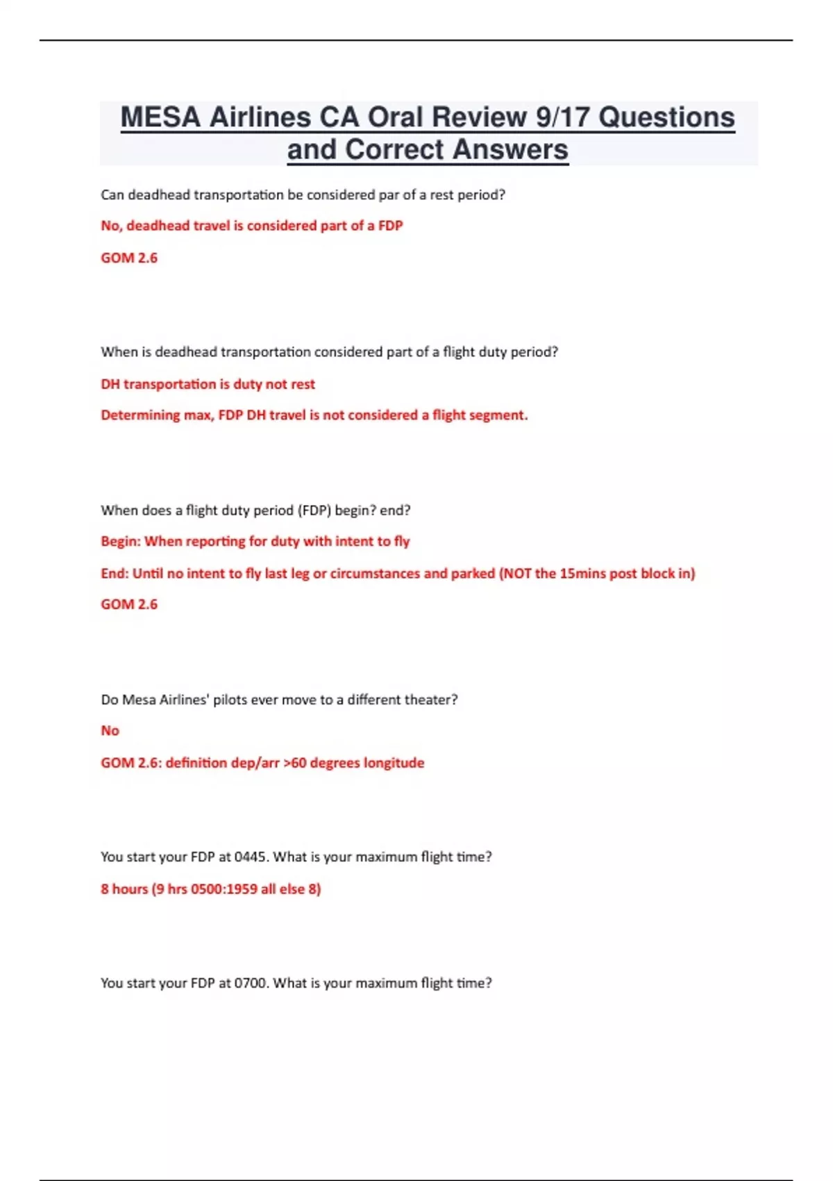MESA Airlines CA Oral Review 9/17 Questions and Correct Answers