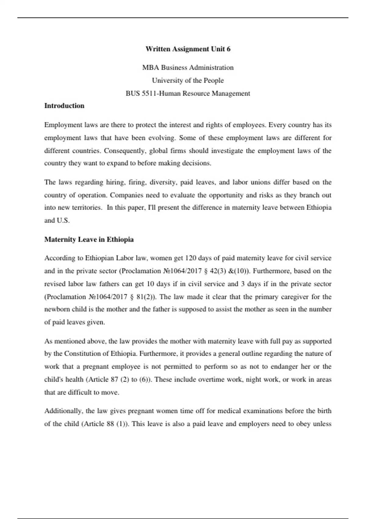 into new territories. In this paper, I'll present the difference in maternity leave between Ethiopia