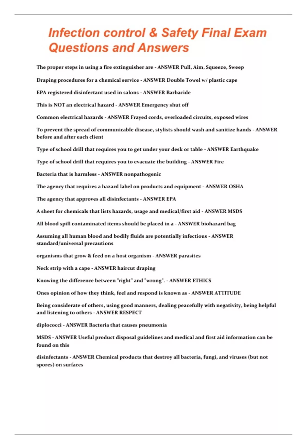Infection Control & Safety Final Exam Questions and Answers