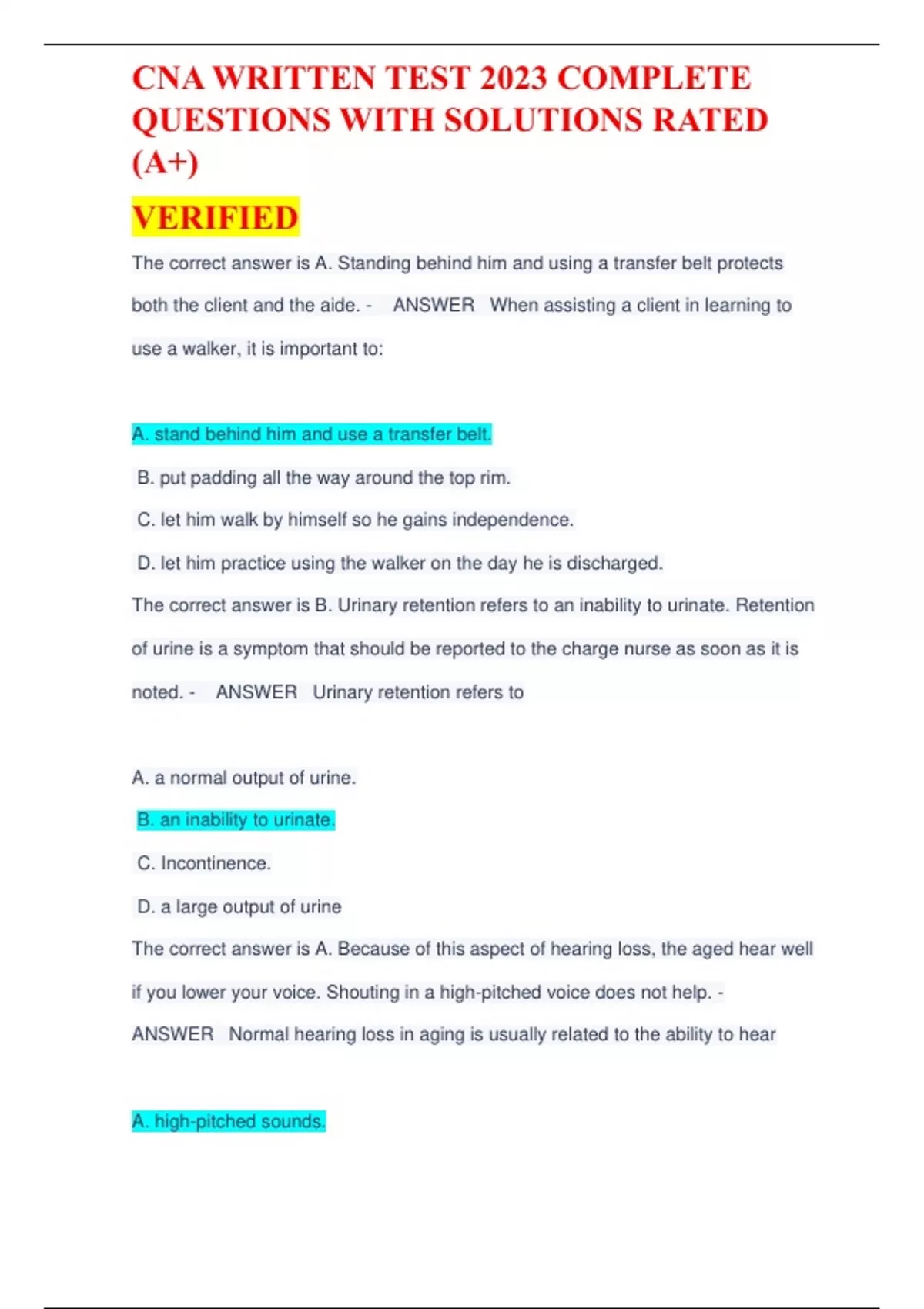 The correct answer is A. Standing behind him and using a transfer belt protects both the client and the aide. - ANSWER When assisting a client in learning to use a walker, it is important to: A. stand behind him and use a transfer belt. B. put padding all the way around the top rim. C. let him walk by himself so he gains independence. D. let him practice using the walker on the day he is discharged. The correct answer is B. Urinary retention refers to an inability to urinate. Retention of urine is a symptom that should be reported to the charge nurse as soon as it is noted. - ANSWER Urinary retention refers to A. a normal output of urine. B. an inability to urinate. C. Incontinence. D. a large output of urine The correct answer is A. Because of this aspect of hearing loss, the aged hear well if you lower your voice. Shouting in a high-pitched voice does not help. - ANSWER Normal hearing loss in aging is usually related to the ability to hear A. high-pitched sounds.