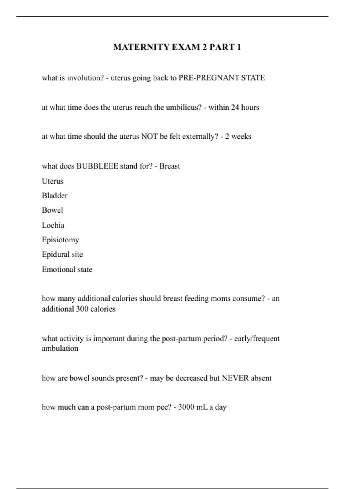 what is involution? - uterus going back to PRE-PREGNANT STATE at what time does the uterus reach the umbilicus? - within 24 hours at what time should the uterus NOT be felt externally? - 2 weeks what does BUBBLEEE stand for? - Breast Uterus Bladder Bowel Lochia Episiotomy Epidural site Emotional state how many additional calories should breast feeding moms consume? - an additional 300 calories what activity is important during the post-partum period? - early/frequent ambulation how are bowel sounds present? - may be decreased but NEVER absent how much can a post-partum mom pee? - 3000 mL a dayhow early should the mom void after delivery? - within 4 hours what is rubra? - bright red 1-4 days what is serosa? - light pink/brown 4-10 days what is alba? - white/yellow 10 days-6 weeks what does foul odor of lochia implement? - infection what is early postpartum hemorrhage? - Hemorrhage in the first 24 hours after childbirth what is the most common cause in early postpartum hemorrhage and does it mean? - uterine atony: no tone in the uterus