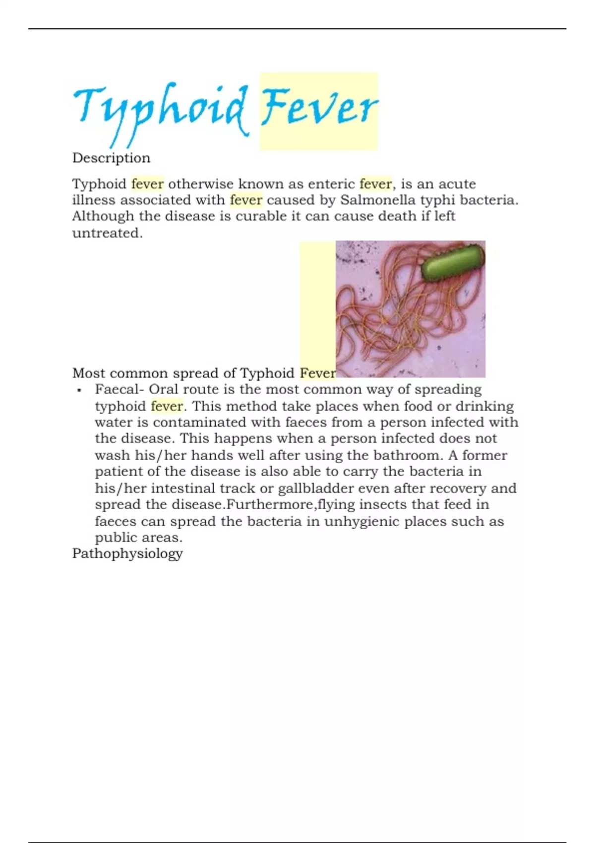 illness associated with fever caused by Salmonella typhi bacteria.