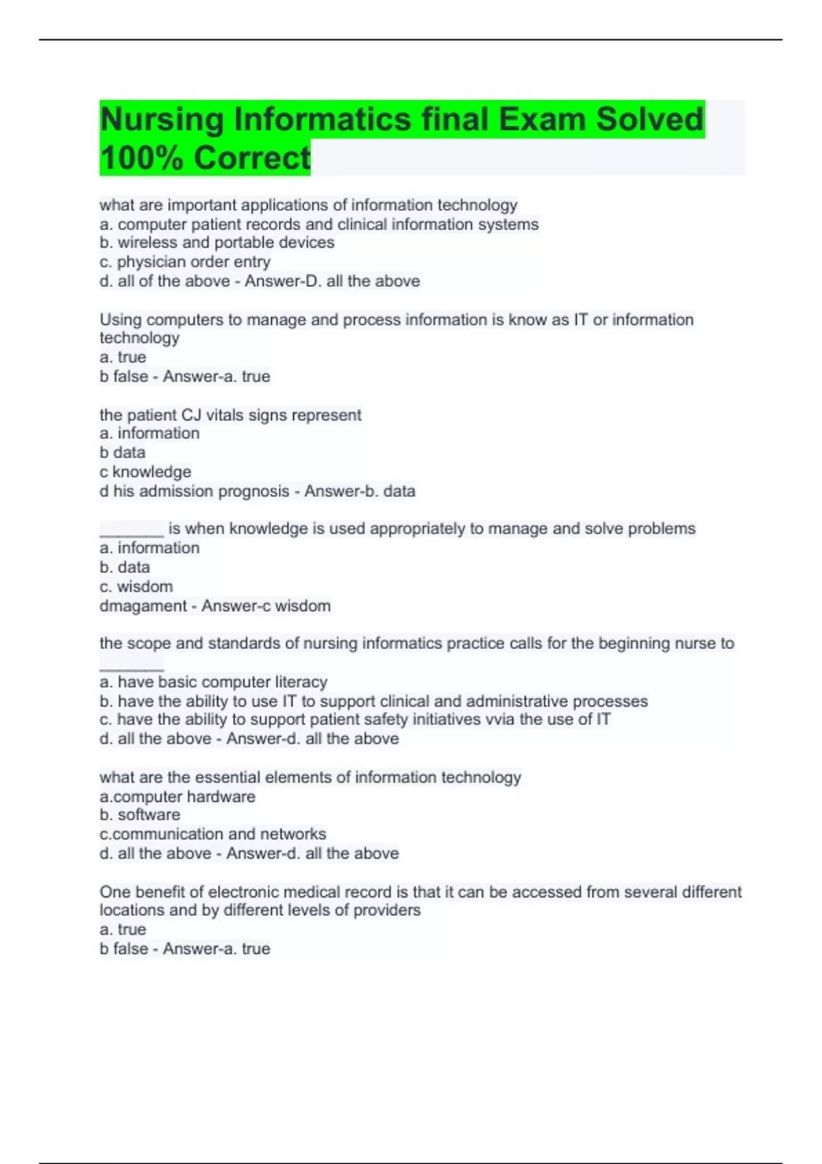 Nursing Informatics final Exam Solved 100% Correct
