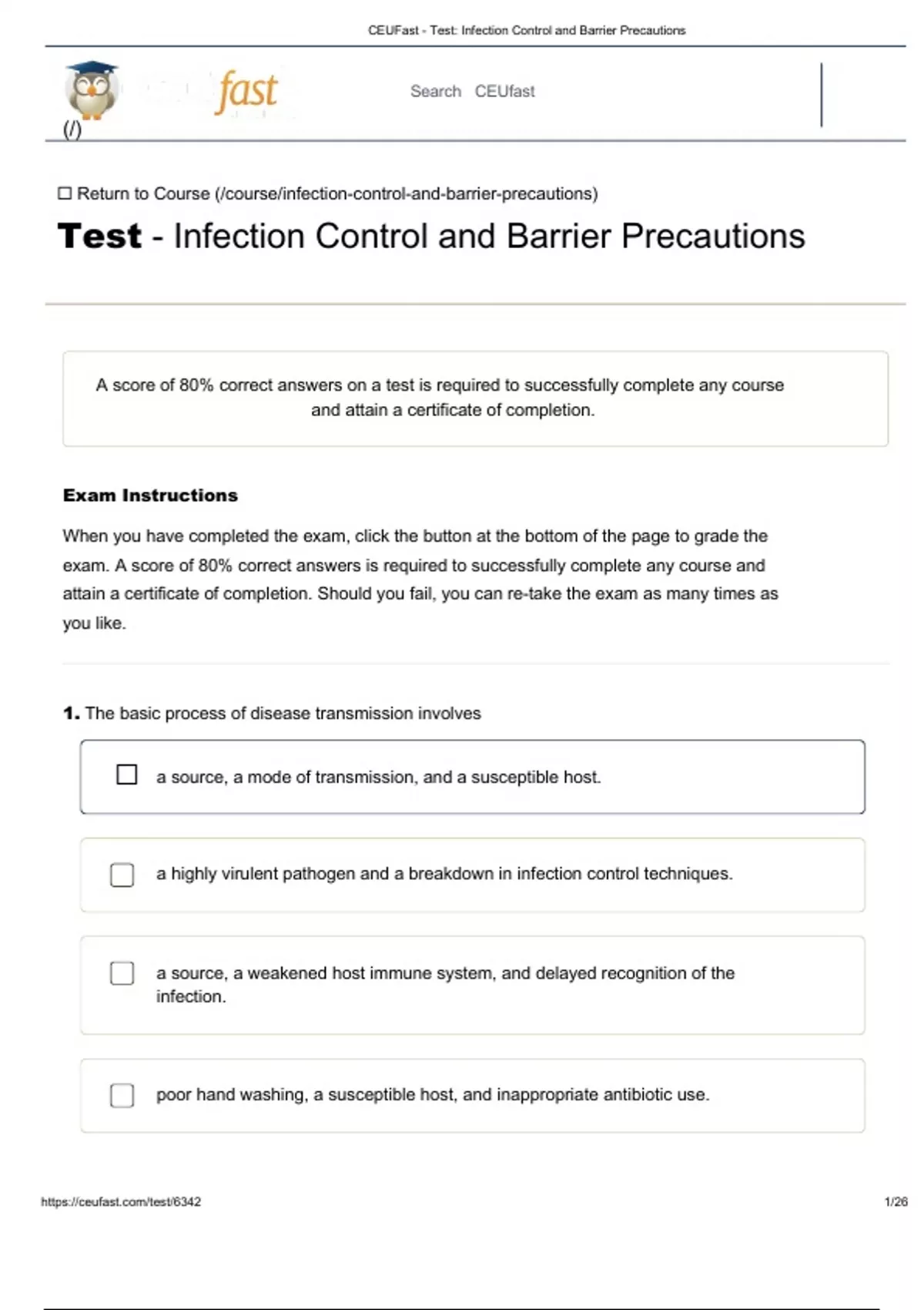 CEUFast - Test Infection Control and Barrier Precautions With 100%Correct Answers. A score of 80% correct answers on a test is required to successfully complete any course and attain a certificate of completion. Exam Instructions When you have completed the exam, click the button at the bottom of the page to grade the exam. A score of 80% correct answers is required to successfully complete any course and attain a certificate of completion. Should you fail, you can re-take the exam as many times as you like. 1. The basic process of disease transmission involves a source, a mode of transmission, and a susceptible host. a highly virulent pathogen and a breakdown in infection control techniques. a source, a weakened host immune system, and delayed recognition of the infection. poor hand washing, a susceptible host, and inappropriate antibiotic use. (/) CEUFast - Test: Infection Control and Barrier Precautions 2. Nurse A touches an infected stethoscope, doesn’t wash his hands, and then touches a patient. This is an example of: 3. Pathogens released by coughing but that do not remain airborne for long move person-toperson by 4. MRSA is often found Indirect contact transmission. Colonization. Direct contact transmission. Infection. airborne transmission. indirect contact transmission. direct contact transmission. droplet contact transmission. in drinking water. CEUFast - Test: Infection Control and Barrier Precautions 5. Multi-drug resistant tuberculosis is becoming more common because of 6. Standard Precautions are considered mandatory because on stethoscopes. in the air. in sweat. The age of the hosts contracting TB. Poor compliance with drug regimens. Poor compliance with infection control techniques. Increased population density in affected areas.