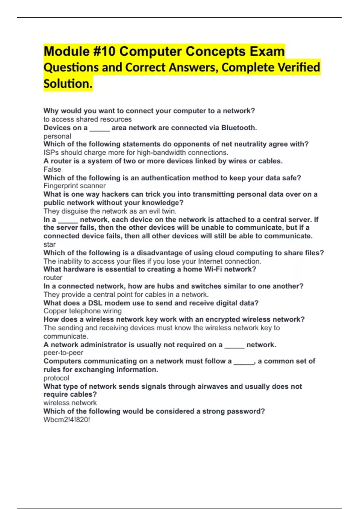 Module #10 Computer Concepts Exam Questions and Correct Answers, Complete Verified Solution. Why would you want to connect your computer to a network? to access shared resources Devices on a _____ area network are connected via Bluetooth. personal Which of the following statements do opponents of net neutrality agree with? ISPs should charge more for high-bandwidth connections. A router is a system of two or more devices linked by wires or cables. False Which of the following is an authentication method to keep your data safe? Fingerprint scanner What is one way hackers can trick you into transmitting personal data over on a public network without your knowledge? They disguise the network as an evil twin. In a _____ network, each device on the network is attached to a central server. If the server fails, then the other devices will be unable to communicate, but if a connected device fails, then all other devices will still be able to communicate. star Which of the following is a disadvantage of using cloud computing to share files? The inability to access your files if you lose your Internet connection. What hardware is essential to creating a home Wi-Fi network? router