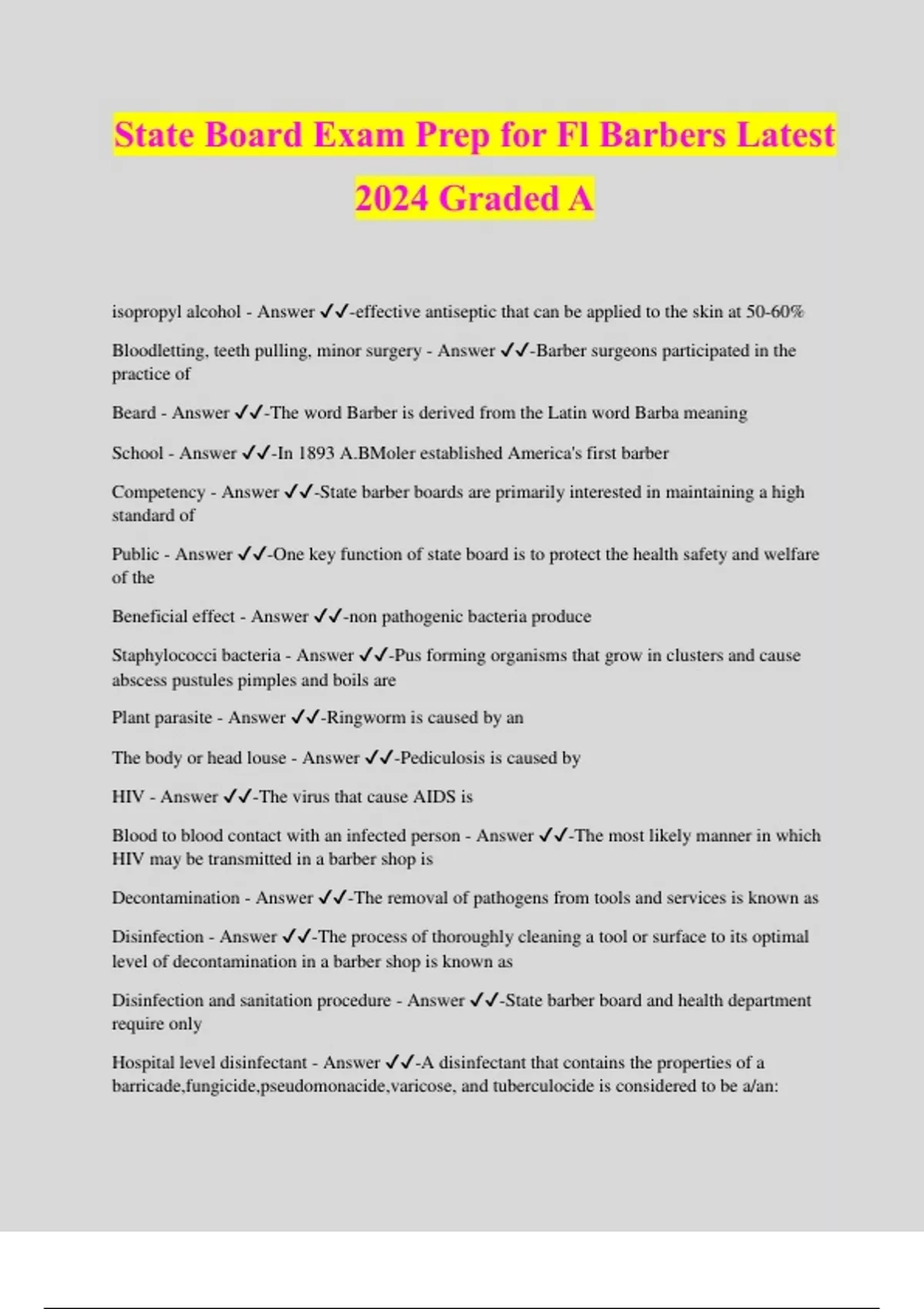 State Board Exam Prep for Fl Barbers Latest 2024 Graded A