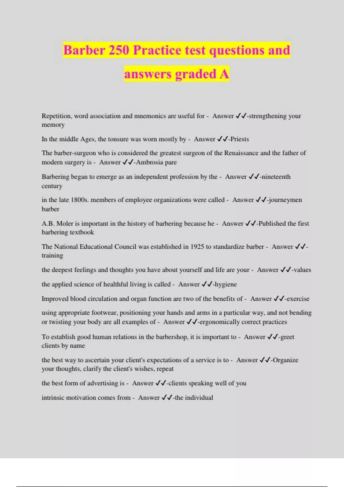 Barber 250 Practice test questions and answers graded A Repetition, word association and mnemonics are useful for - Answer ️️ -strengthening your memory In the middle Ages, the tonsure was worn mostly by - Answer ️️ -Priests The barber-surgeon who is considered the greatest surgeon of the Renaissance and the father of modern surgery is - Answer ️️ -Ambrosia pare Barbering began to emerge as an independent profession by the - Answer ️️ -nineteenth century in the late 1800s. members of employee organizations were called - Answer ️️ -journeymen barber A.B. Moler is important in the history of barbering because he - Answer ️️ -Published the first barbering textbook The National Educational Council was established in 1925 to standardize barber - Answer ️️ - training the deepest feelings and thoughts you have about yourself and life are your - Answer ️️ -values the applied science of healthful living is called - Answer ️️ -hygiene Improved blood circulation and organ function are two of the benefits of - Answer ️️ -exercise using appropriate footwear, positioning your hands and arms in a particular way, and not bending or twisting your body are all examples of - Answer ️️ -ergonomically correct practices To establish good human relations in the barbershop, it is important to - Answer ️️ -greet clients by name the best way to ascertain your client's expectations of a service is to - Answer ️️ -Organize your thoughts, clarify the client's wishes, repeat the best form of advertising is - Answer ️️ -clients speaking well of you intrinsic motivation comes from - Answer ️️ -the individual elements of effective goal-setting do not include - Answer ️️ -discarding a goal if is not immediately successful to manage your time efficiently - Answer ️️ -take time out to re-energize a type of bacteria that live on dead matter and do not cause disease is - Answer ️️ -saprophytes Short. rod-shaped bacteria are called - Answer ️️ -Bacilli Bacilli cause - Answer ️️ -tubercuiosis Spirilla cause - Answer ️️ -syphilis the cocci bacteria that cause abscesses, pustules, pimples, and boils are - Answer ️️ - staphylococci When the bloodstream carries bacteria and their toxins to all parts of the body, the result is a - Answer ️️ -general infection A contagious disease is - Answer ️️ -transmitted from one person to another A barber should not service clients with - Answer ️️ -ringworm when pathogens and their products are absorbed into the bloodstream, the result is a poisoned state called - Answer ️️ -sepsis Ringworm is caused by - Answer ️️ -a fungus Scabies is caused by - Answer ️️ -An animal para