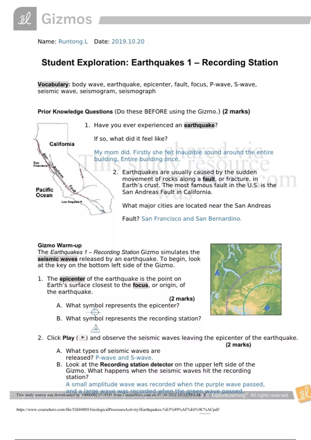 Earthquakes 1 – Recording Station GIZMO < ALL ANSWERS CORRECT>