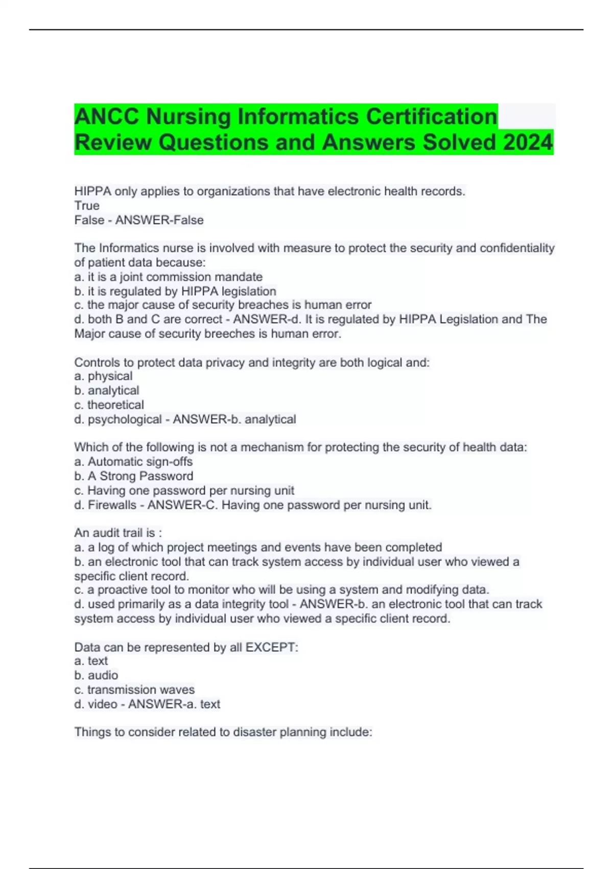 ANCC Nursing Informatics Certification Review Questions and Answers Solved 2024