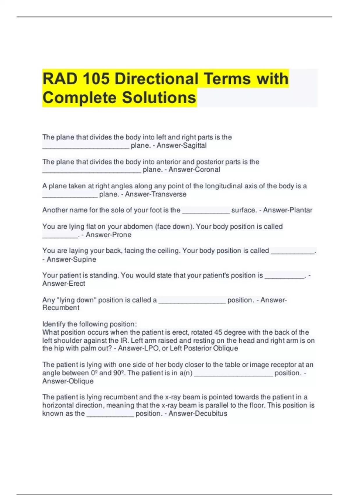 RAD 105 Directional Terms with Complete Solutions The plane that divides the body into left and right parts is the ______________________ plane. - Answer-Sagittal The plane that divides the body into anterior and posterior parts is the _________________________ plane. - Answer-Coronal A plane taken at right angles along any point of the longitudinal axis of the body is a ______________ plane. - Answer-Transverse Another name for the sole of your foot is the ____________ surface. - Answer-Plantar You are lying flat on your abdomen (face down). Your body position is called _________. - Answer-Prone You are laying your back, facing the ceiling. Your body position is called ___________. - Answer-Supine Your patient is standing. You would state that your patient's position is __________. - Answer-Erect Any "lying down" position is called a _________________ position. - Answer-Recumbent Identify the following position: What position occurs when the patient is erect, rotated 45 degree with the back of the left shoulder against the IR. Left arm raised and resting on the head and right arm is on the hip with palm out? - Answer-LPO, or Left Posterior Oblique The patient is lying with one side of her body closer to the table or image receptor at an angle between 0º and 90º. The patient is in a(n) ____________________ position. - Answer-Oblique