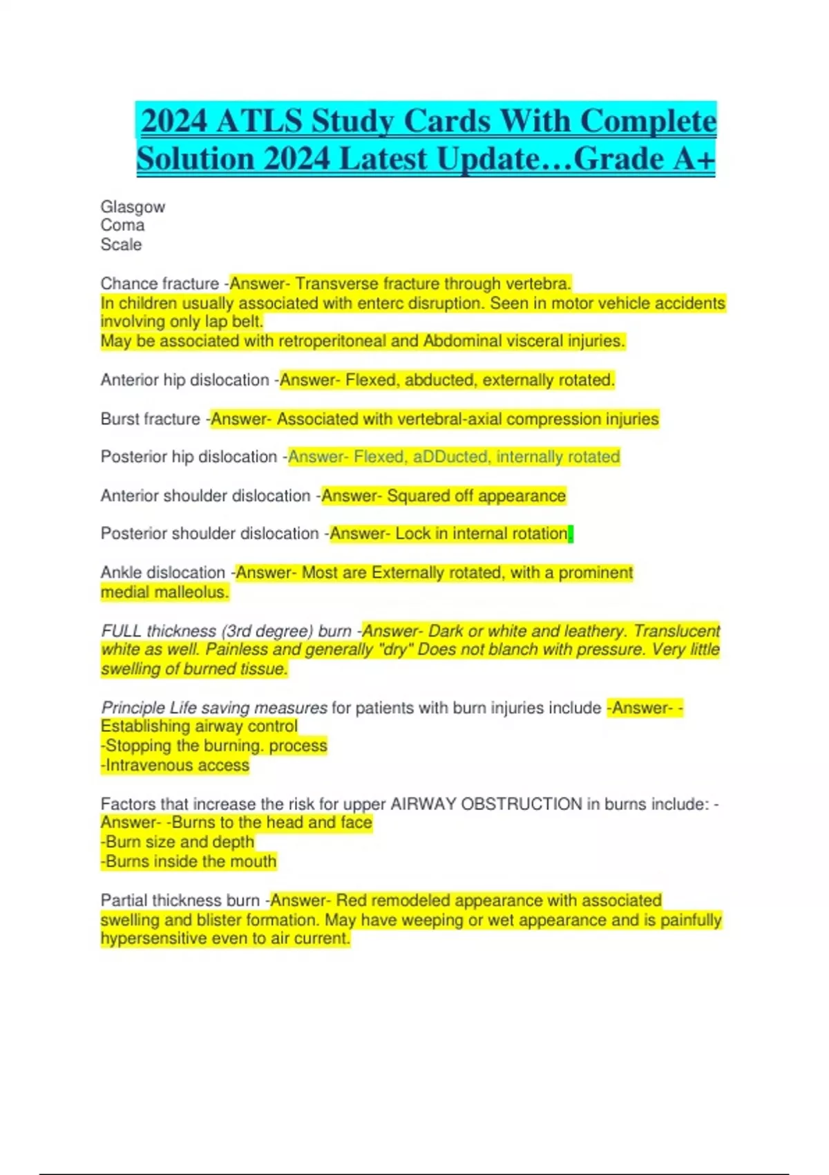 2024 ATLS Study Cards With Complete Solution 2024 Latest Update…Grade A+ Glasgow Coma Scale Chance fracture -Answer- Transverse fracture through vertebra. In children usually associated with enterc disruption. Seen in motor vehicle accidents involving only lap belt. May be associated with retroperitoneal and Abdominal visceral injuries. Anterior hip dislocation -Answer- Flexed, abducted, externally rotated. Burst fracture -Answer- Associated with vertebral-axial compression injuries Posterior hip dislocation -Answer- Flexed, aDDucted, internally rotated Anterior shoulder dislocation -Answer- Squared off appearance Posterior shoulder dislocation -Answer- Lock in internal rotation. Ankle dislocation -Answer- Most are Externally rotated, with a prominent medial malleolus. FULL thickness (3rd degree) burn -Answer- Dark or white and leathery. Translucent white as well. Painless and generally "dry" Does not blanch with pressure. Very little swelling of burned tissue. Principle Life saving measures for patients with burn injuries include -Answer- - Establishing airway control -Stopping the burning. process -Intravenous access Factors that increase the risk for upper AIRWAY OBSTRUCTION in burns include: - Answer- -Burns to the head and face -Burn size and depth -Burns inside the mouth Partial thickness burn -Answer- Red remodeled appearance with associated swelling and blister formation. May have weeping or wet appearance and is painfully hypersensitive even to air current. Signs and symptoms and history that suggest INHALATION INJURY include: - Answer-These patients should be intubated. Inhalation injury is an indication for transfer to a burn center.