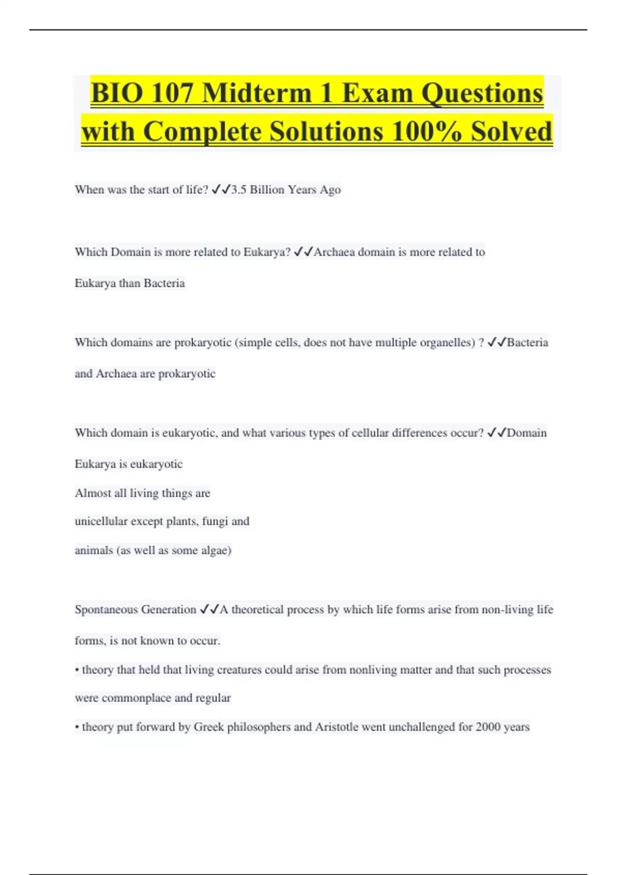 BIO 107 Midterm 1 Exam Questions with Complete Solutions 100% Solved When was the start of life? 3.5 Billion Years Ago Which Domain is more related to Eukarya? Archaea domain is more related to Eukarya than Bacteria Which domains are prokaryotic (simple cells, does not have multiple organelles) ? Bacteria and Archaea are prokaryotic Which domain is eukaryotic, and what various types of cellular differences occur? Domain Eukarya is eukaryotic Almost all living things are unicellular except plants, fungi and animals (as well as some algae) Spontaneous Generation A theoretical process by which life forms arise from non-living life forms, is not known to occur. • theory that held that living creatures could arise from nonliving matter and that such processes were commonplace and regular • theory put forward by Greek philosophers and Aristotle went unchallenged for 2000 years