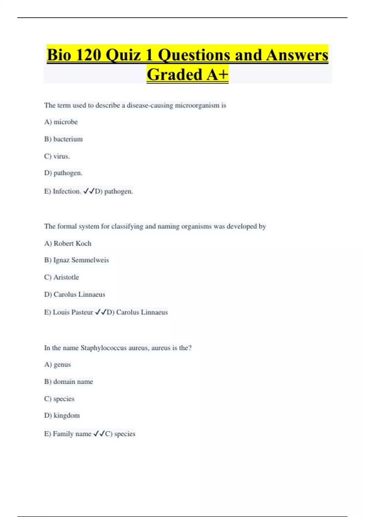 Bio 120 Quiz 1 Questions and Answers Graded A+ The term used to describe a disease-causing microorganism is A) microbe B) bacterium C) virus. D) pathogen. E) Infection. D) pathogen. The formal system for classifying and naming organisms was developed by A) Robert Koch B) Ignaz Semmelweis C) Aristotle D) Carolus Linnaeus E) Louis Pasteur D) Carolus Linnaeus In the name Staphylococcus aureus, aureus is the? A) genus B) domain name C) species D) kingdom E) Family name C) species