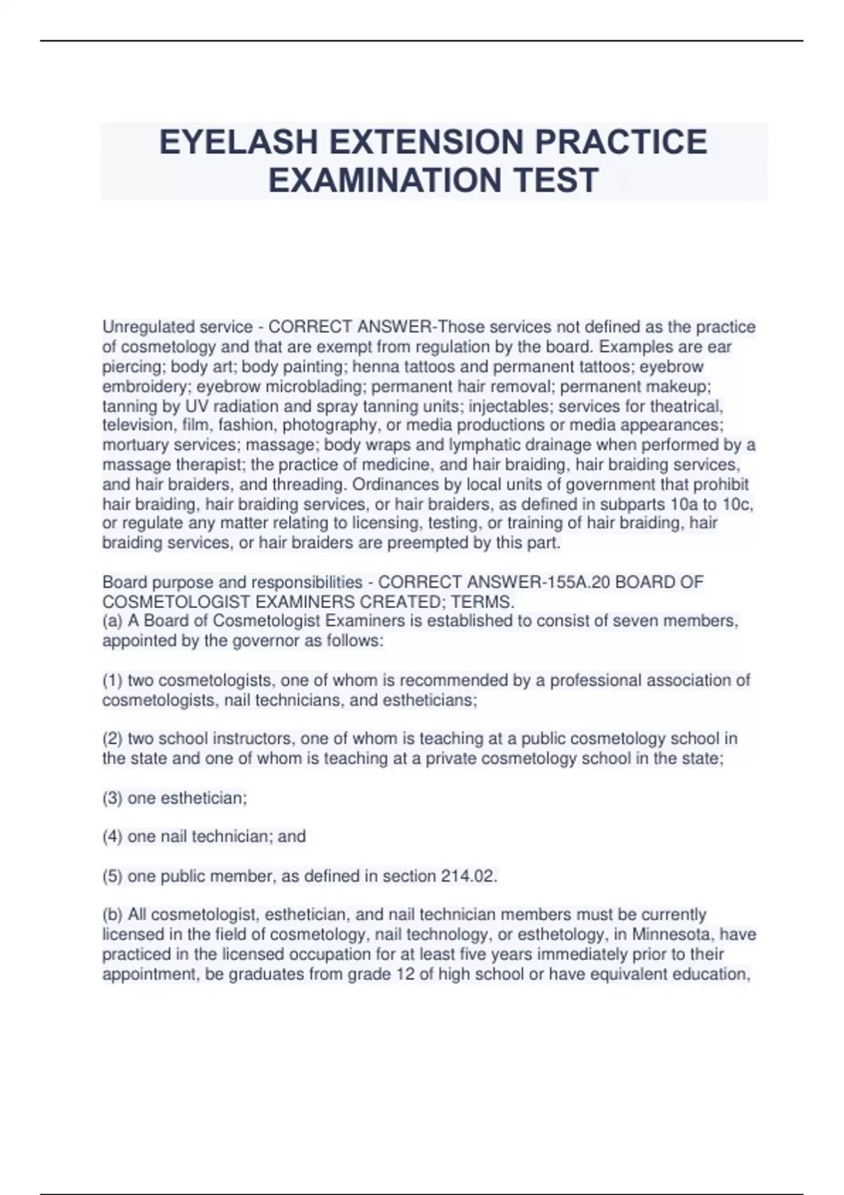EYELASH EXTENSION PRACTICE EXAMINATION TEST Unregulated service - CORRECT ANSWER-Those services not defined as the practice of cosmetology and that are exempt from regulation by the board. Examples are ear piercing; body art; body painting; henna tattoos and permanent tattoos; eyebrow embroidery; eyebrow microblading; permanent hair removal; permanent makeup; tanning by UV radiation and spray tanning units; injectables; services for theatrical, television, film, fashion, photography, or media productions or media appearances; mortuary services; massage; body wraps and lymphatic drainage when performed by a massage therapist; the practice of medicine, and hair braiding, hair braiding services, and hair braiders, and threading. Ordinances by local units of government that prohibit hair braiding, hair braiding services, or hair braiders, as defined in subparts 10a to 10c, or regulate any matter relating to licensing, testing, or training of hair braiding, hair braiding services, or hair braiders are preempted by this part. Board purpose and responsibilities - CORRECT ANSWER-155A.20 BOARD OF COSMETOLOGIST EXAMINERS CREATED; TERMS. (a) A Board of Cosmetologist Examiners is established to consist of seven members, appointed by the governor as follows: (1) two cosmetologists, one of whom is recommended by a professional association of cosmetologists, nail technicians, and estheticians; (2) two school instructors, one of whom is teaching at a public cosmetology school in the state and one of whom is teaching at a private cosmetology school in the state; (3) one esthetician; (4) one nail technician; and (5) one public member, as defined in section 214.02. (b) All cosmetologist, esthetician, and nail technician members must be currently licensed in the field of cosmetology, nail technology, or esthetology, in Minnesota, have practiced in the licensed occupation for at least five years immediately prior to their appointment, be graduates from grade 12 of high school or have equivalent education, and have knowledge of sections 155A.21 to 155A.36 and Minnesota Rules, chapters 2105 and 2110. (c) Membership terms, compensation of members, removal of members, the filling of membership vacancies, and fiscal year and reporting requirements shall be as provided in sections 214.07 to 214.09. The provision of staff, administrative services, and office space; the review and processing of complaints; the setting of board fees; and other provisions relating to board operations shall be as provided in chapter 214. (d) Members appointed to fill vacancies caused by death, resignation, or removal shall serve during the unexpired term of their predecessors. 155A.21 POLICY. The legislature finds that the health and safety of the people of the state are served by the licensing of the practice of cosmetology because of infection control and the use of chemicals, implements, apparatus, and other appliances re Licensing - CORRECT ANSWER-A person must hold an individual _____ License License Cycyle to practice in the state as a cosmetologist, esthetician, nail technician, eyelash technician, advanced practice esthetician, manager, or instructor. Display of License - CORRECT ANSWER-Every holder of a license granted by the board shall display it in a conspicuous place in the place of business. Maintaining individual licenses - CORRECT ANSWER-Compliance with applicable law, New services or devices, name/address change, renewal, and display of license. name - CORRECT ANSWER-Within 30 days of any legal _____ change, licensees must provide legal documentation of change and pay any fee. The current license will be invalid on the 31st day of the new legal _____ change. Compliance with applicable law - CORRECT ANSWER-The licensee is responsible for verifying that the salon or school in which the licensee is practicing has an active license, and the licensee must continuously comply with all applicable provisions of Minnesota statutes and rules. New services or devices - CORRECT ANSWER-Before providing any service using a product, technique, device, or equipment new to the licensee, the licensee must: A. ensure that the use of the product, device, or technique is within the licensee's scope of practice; B. review and comply with any manufacturer's directions for use, safety requirements, and contraindications; C. maintain a record of any training received by the licensee on the product, technique, or device, for as long as the licensee is using the product, technique, or device; and D. attest that the licensee has the knowledge and training necessary to safely provide the service using the new product, technique, or device.