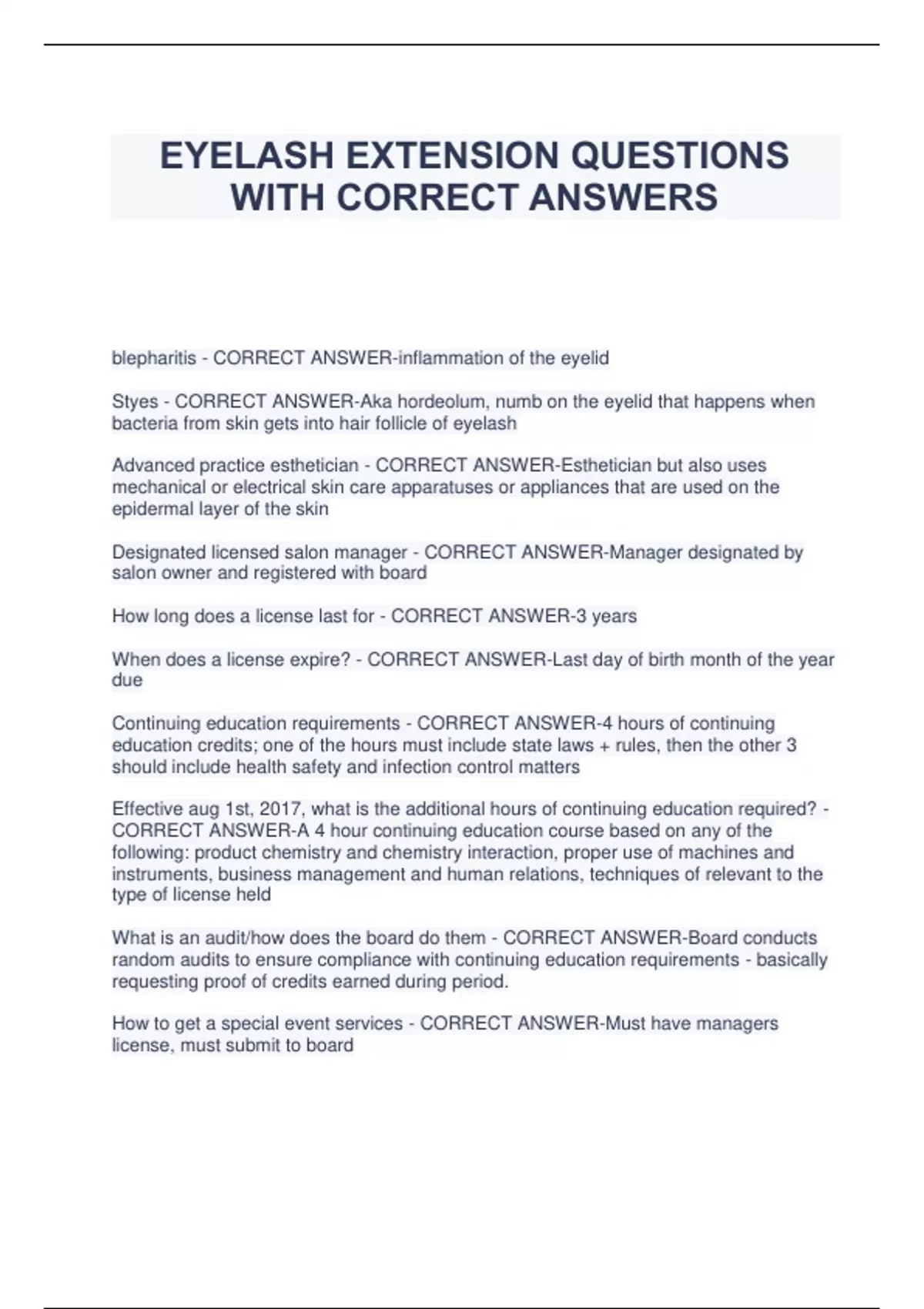 EYELASH EXTENSION QUESTIONS WITH CORRECT ANSWERS blepharitis - CORRECT ANSWER-inflammation of the eyelid Styes - CORRECT ANSWER-Aka hordeolum, numb on the eyelid that happens when bacteria from skin gets into hair follicle of eyelash Advanced practice esthetician - CORRECT ANSWER-Esthetician but also uses mechanical or electrical skin care apparatuses or appliances that are used on the epidermal layer of the skin Designated licensed salon manager - CORRECT ANSWER-Manager designated by salon owner and registered with board How long does a license last for - CORRECT ANSWER-3 years When does a license expire? - CORRECT ANSWER-Last day of birth month of the year due Continuing education requirements - CORRECT ANSWER-4 hours of continuing education credits; one of the hours must include state laws + rules, then the other 3 should include health safety and infection control matters Effective aug 1st, 2017, what is the additional hours of continuing education required? - CORRECT ANSWER-A 4 hour continuing education course based on any of the following: product chemistry and chemistry interaction, proper use of machines and instruments, business management and human relations, techniques of relevant to the type of license held What is an audit/how does the board do them - CORRECT ANSWER-Board conducts random audits to ensure compliance with continuing education requirements - basically requesting proof of credits earned during period. How to get a special event services - CORRECT ANSWER-Must have managers license, must submit to board Requirements to license a salon - CORRECT ANSWER-1. Compliance with all local/states laws 2. Employment of a manager 3. Evidence of workers compensation 4. Evidence of continued professional liability insurance coverage of at least 25k for each claim and 50k total coverage for each policy year for each operator Requirements for a mobile salon - CORRECT ANSWER-1. Maintain permanent business address 2. Notify the board of locations and schedule or operation Compensation - CORRECT ANSWER-A monetary or nonmonetary remuneration for services Good repair - CORRECT ANSWER-Means that the item is clean, no holes, no frayed wires or tears in coverings. Homebound - CORRECT ANSWER-Means individual lacks physical/intellectual capacity for transportation Operator - CORRECT ANSWER-Means a standard license for a cosmetologist, esthetician, or nail tech Porous material - CORRECT ANSWER-Material that absorbs in liquid School subject to penalty for violations during inspection for: - CORRECT ANSWER-1. Each expired instructor license 2. An expired DSM license 3. Am expired school license 4. Each current license of anyone license not displayed 5. Reuse or failure to dispose single use items 6. Presence of prohibited razor type a DSM is subject to penalty for violations cited during school inspection for: - CORRECT ANSWER-1. Each instructor w expired license 2. Expired DSM license 3. Expired school license 4. Each current license not displayed 5. Reuse of failure to dispose single use items 6. Presence of razor type 7. DSMs refusal or failure to cooperate with an inspection Maximum total inspection per license per inspection can't exceed - CORRECT ANSWER-3k for school 2k for school manager 1k for each instructor School with a license that was suspended or revoked must apply for relicensure as follows: - CORRECT ANSWER-1. Apply for relicensure on forms by board 2. Meet requirements for reinstatement 3. Pay fees for new applicant Cosmetologist training requirements - CORRECT ANSWER-1. 1550 hours of coursework & include nail tech, full esti course content, & balance in hair services 2. 1130 hours of everything else and 420 hours of instruction in related theory and sciences 3. First 240 hours must consist of preclinical instruction in theory of sciences of anatomy, dermatology, trixholofy, manicuring, + chemistry Esthetician training requirements - CORRECT ANSWER-1. 600 hours in total 2. First 120 hours preclinical instruction in the theory of sciences of anatomy, dermatology, and chemistry. 3. Must be instruction in applied science & skills in procedures of cosmetic care of skin, applicants of face and makeup & in waxing. 4. Each student must complete 60 facials, 40 makeup, 20 face waxes, 20 body waxes. 5. Documentation of students completion of all required Nail tech hours - CORRECT ANSWER-350 What you need for every product you use - CORRECT ANSWER-Material safety data sheet Soap and water is adequate for cleaning your tools - CORRECT ANSWER-False Name two acceptable methods of sterilizing your tools & tweezers - CORRECT ANSWER-We don't sterilize, we sanitize When preparing the eye area for treatment you should... - CORRECT ANSWER-• make sure to apply pads above lash line •always cover Lowe lashes with tape and under eye patches How many mins should clients eyes remain closed for following the application - CORRECT ANSWER-2 mins Contraindication - CORRECT ANSWER-A reason something is not advisable or should not be done An average human eyelash can grow from between - CORRECT ANSWER-7-10 mm 3 main stages of eyelash growth are - CORRECT ANSWER-New growth, medium growth, mature growth