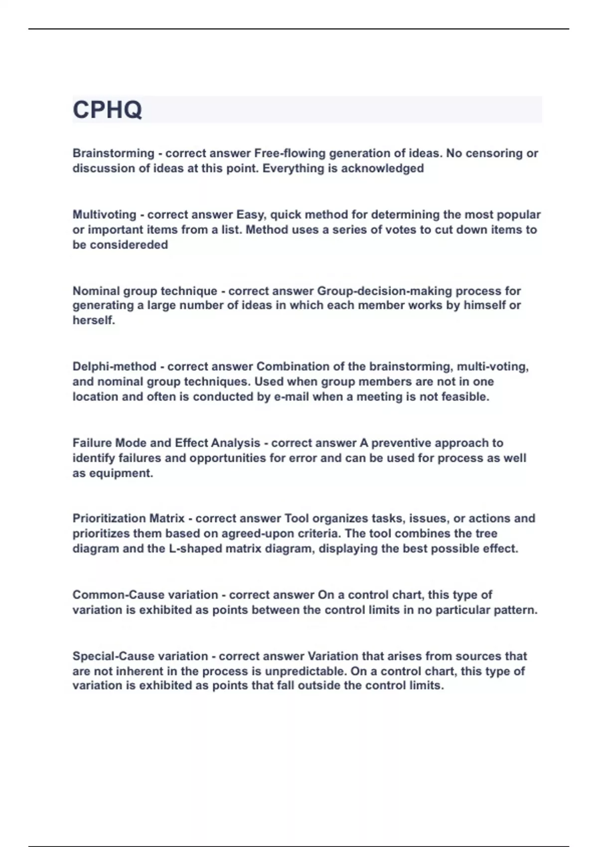 Brainstorming - correct answer Free-flowing generation of ideas. No censoring or discussion of ideas at this point. Everything is acknowledged Multivoting - correct answer Easy, quick method for determining the most popular or important items from a list. Method uses a series of votes to cut down items to be considereded