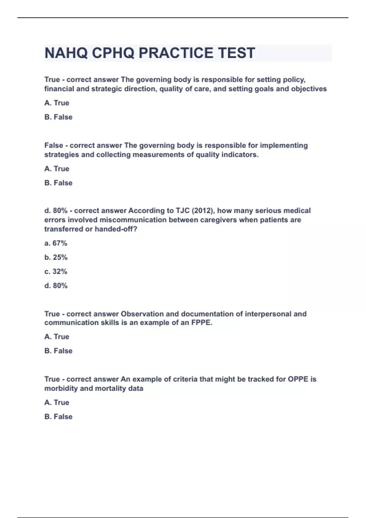 NAHQ CPHQ PRACTICE TEST True - correct answer The governing body is responsible for setting policy, financial and strategic direction, quality of care, and setting goals and objectives A. True B. False False - correct answer The governing body is responsible for implementing strategies and collecting measurements of quality indicators. A. True B. False