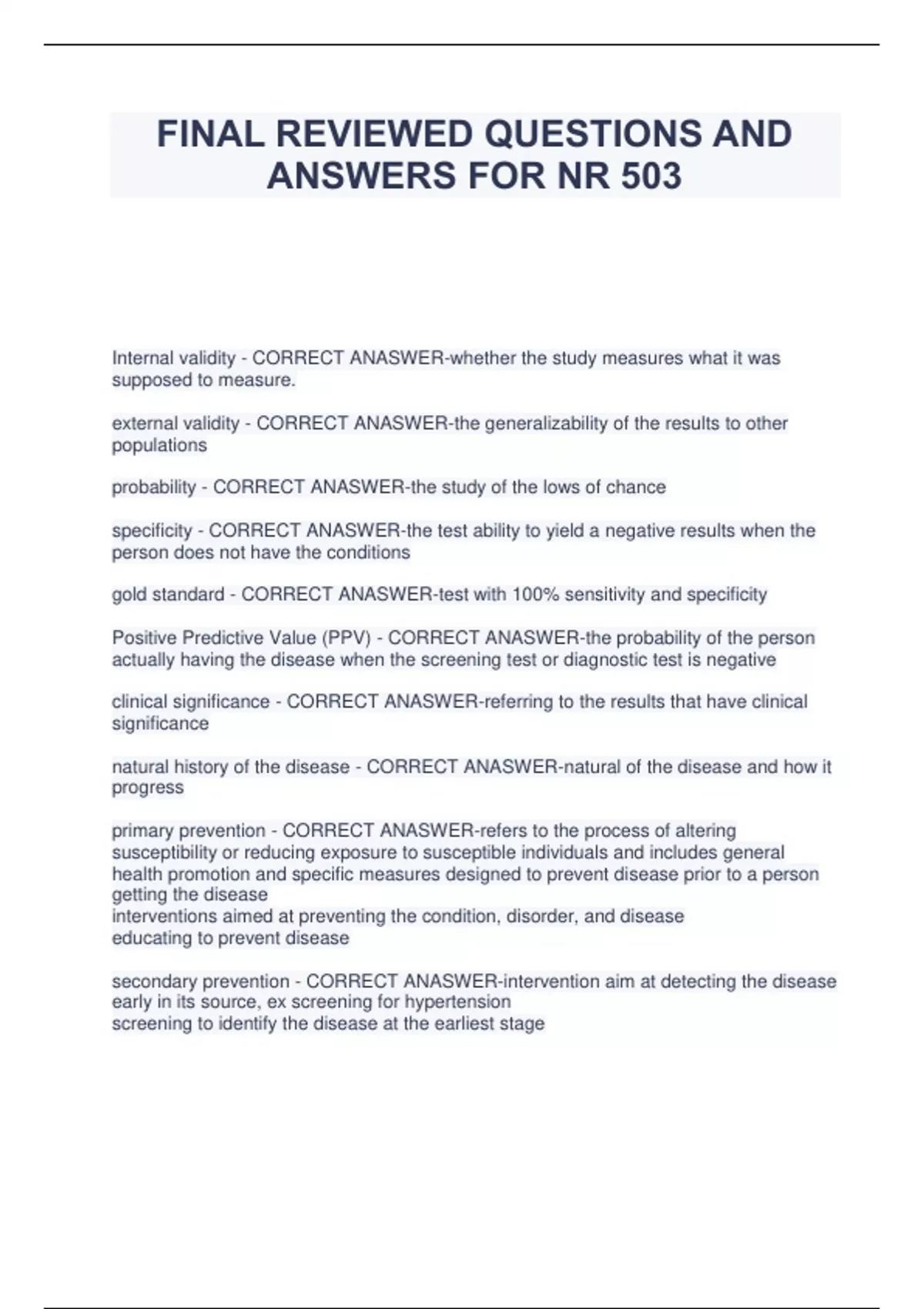 FINAL REVIEWED QUESTIONS AND ANSWERS FOR NR 503 Internal validity - CORRECT ANASWER-whether the study measures what it was supposed to measure. external validity - CORRECT ANASWER-the generalizability of the results to other populations probability - CORRECT ANASWER-the study of the lows of chance specificity - CORRECT ANASWER-the test ability to yield a negative results when the person does not have the conditions gold standard - CORRECT ANASWER-test with 100% sensitivity and specificity Positive Predictive Value (PPV) - CORRECT ANASWER-the probability of the person actually having the disease when the screening test or diagnostic test is negative clinical significance - CORRECT ANASWER-referring to the results that have clinical significance natural history of the disease - CORRECT ANASWER-natural of the disease and how it progress primary prevention - CORRECT ANASWER-refers to the process of altering susceptibility or reducing exposure to susceptible individuals and includes general health promotion and specific measures designed to prevent disease prior to a person getting the disease interventions aimed at preventing the condition, disorder, and disease educating to prevent disease secondary prevention - CORRECT ANASWER-intervention aim at detecting the disease early in its source, ex screening for hypertension screening to identify the disease at the earliest stage tertiary prevention - CORRECT ANASWER-strategies are implemented during the middle or late stages of clinical disease and refer to measures taken to alleviate disability and restore effective functioning. limiting the effects of the disease once is established ex rehabilitations programs. True Positive (TP) - CORRECT ANASWER-occurs when the test correctly reports disease presence when disease is in fact present. false positive test - CORRECT ANASWER-occurs when the test incorrectly reports disease presence when disease is in fact absent false negative - CORRECT ANASWER-occurs when the test incorrectly reports the absence of disease when disease is in fact present Likehood ratio test (LD) - CORRECT ANASWER-combines sensitivity and specificity data to help the clinician quantify how much the odds of disease changed based on a positive or negative test results. early and middle childhood - CORRECT ANASWER-person to person interventions aim to modify adolescents risk/ protective behaviours and health outcomes by improving their caregiver's parenting skills. adolescent health - CORRECT ANASWER-the us preventive service task force (USPSTF) strongly recommends that all adolescents and adults are at increase risk for HIV infection to be screen. blood disorder and blood safety - CORRECT ANASWER-the us preventive service task force (USPSTF) recommends screening of sickle cell in newborns genomics guidelines - CORRECT ANASWER-the us preventive service task force (USPSTF) recommends that woman whose family hx us associated with an increase risk of deleterious mutations in BRCA1 or BRCA2 genes to be referred for genetic counseling and evaluation for BRCA testing. social determinant of health - CORRECT ANASWER-assess the cleanliness of clients water, food and air. Epidemiology - CORRECT ANASWER-the science of public health. study and analysis of the distributions, patterns and determinants of health and disease conditions in defined populations population health - CORRECT ANASWER-focuses on risk, data, demographics and outcomes for large groups outcome - CORRECT ANASWER-the end results follows and interventions aggregate - CORRECT ANASWER-defined population data - CORRECT ANASWER-compiled information prevalence rates - CORRECT ANASWER-measures the number of cases of disease during a specific period of time snd is measure of burden incidence rates - CORRECT ANASWER-describe the occurrence of new events in a population over a period of time relative to the size of the population at risk. surveillance - CORRECT ANASWER-collection, analysis, dissemination of data high risk - CORRECT ANASWER-increase change of poor health outcome morbidity - CORRECT ANASWER-presence of illness population mortality rates - CORRECT ANASWER-also known as death rates can be useful when evaluating and comparing populations vital statistics - CORRECT ANASWER-quantitative data concerning the population such as # of births, marriages and deaths morbidity - CORRECT ANASWER-refers to having a disease or a symptoms of disease or to amount of disease within a population mortality cases - CORRECT ANASWER-measures of the frequency of occurrence of death in a defined population during an specific interval. social justice - CORRECT ANASWER-the view that everyone deserves equal economic, political and social rights and opportunities this includes the right to good health population - CORRECT ANASWER-focuses on risk data demographics and outcomes campaing of action - CORRECT ANASWER-to implement solutions to the challenges facing the nursing profession and to build upon nurse based approaches to improving quality and transforming health outcomes. population health - CORRECT ANASWER-focuses on risk data, demographics and outcomes Racism - CORRECT ANASWER-Belief that one race is superior to another, prejudice, discrimination cultural broker - CORRECT ANASWER-serves as a mediator between diverse populations