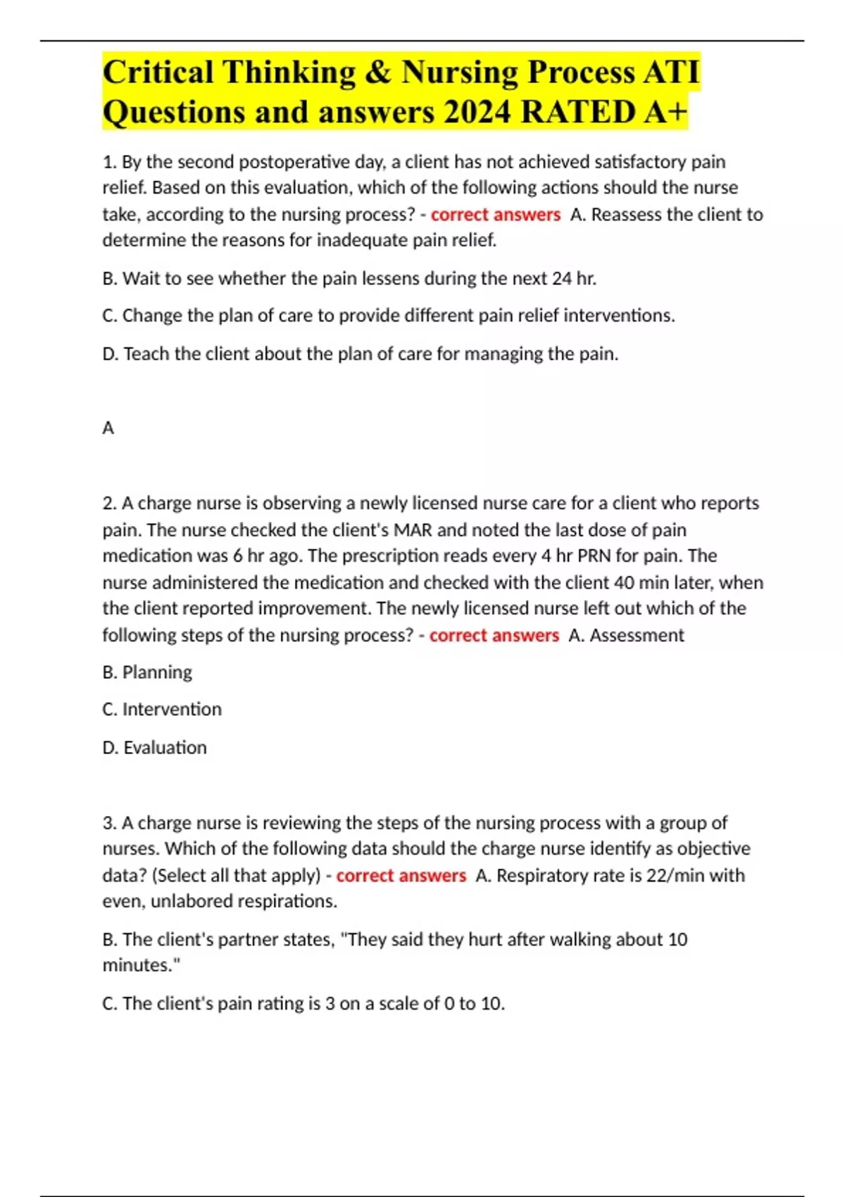 Critical Thinking & Nursing Process ATI Questions and answers 2024 RATED A+