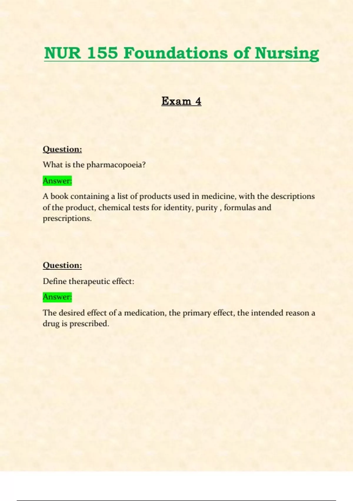 NUR 155 Foundations of Nursing - Galen College of Nursing Exam 4 Question: What is the pharmacopoeia? Answer: A book containing a list of products used in medicine, with the descriptions of the product, chemical tests for identity, purity , formulas and prescriptions. Question: Define therapeutic effect: Answer: The desired effect of a medication, the primary effect, the intended reason a drug is prescribed. Question: Define side effect: Answer: Secondary effect that is unintended. Side effects are usually predictable and may/may not be harmful. Question: Define adverse effect: Answer: Severe side effects or reactions and may justify the discontinuation of a drug.