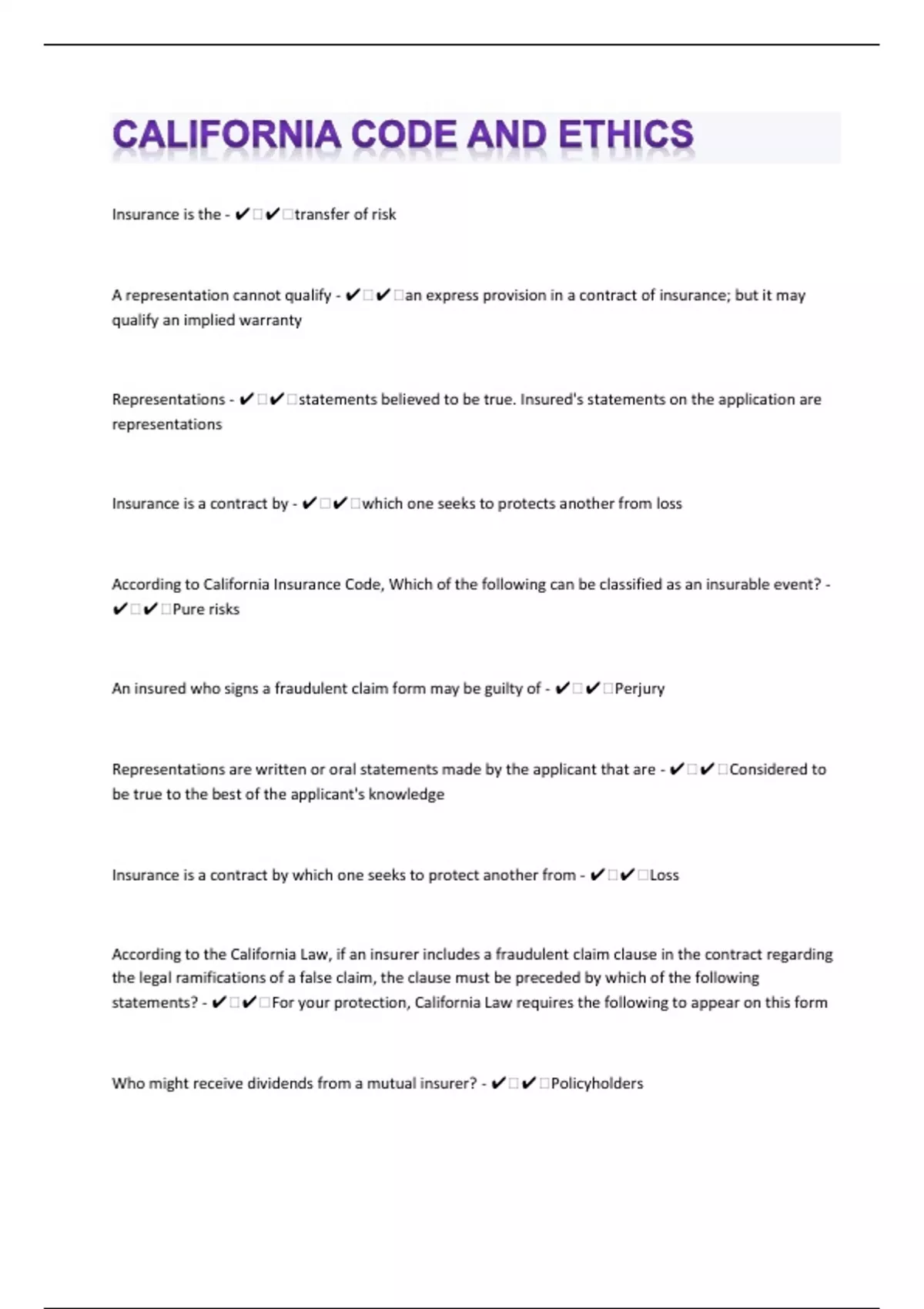 Insurance is the - ️️transfer of risk A representation cannot qualify - ️️an express provision in a contract of insurance; but it may qualify an implied warranty Representations - ️️statements believed to be true. Insured's statements on the application are representations Insurance is a contract by - ️️which one seeks to protects another from loss According to California Insurance Code, Which of the following can be classified as an insurable event? - ️️Pure risks An insured who signs a fraudulent claim form may be guilty of - ️️Perjury Representations are written or oral statements made by the applicant that are - ️️Considered to be true to the best of the applicant's knowledge Insurance is a contract by which one seeks to protect another from - ️️Loss According to the California Law, if an insurer includes a fraudulent claim clause in the contract regarding the legal ramifications of a false claim, the clause must be preceded by which of the following statements? - ️️For your protection, California Law requires the following to appear on this form Who might receive dividends from a mutual insurer? - ️️Policyholders