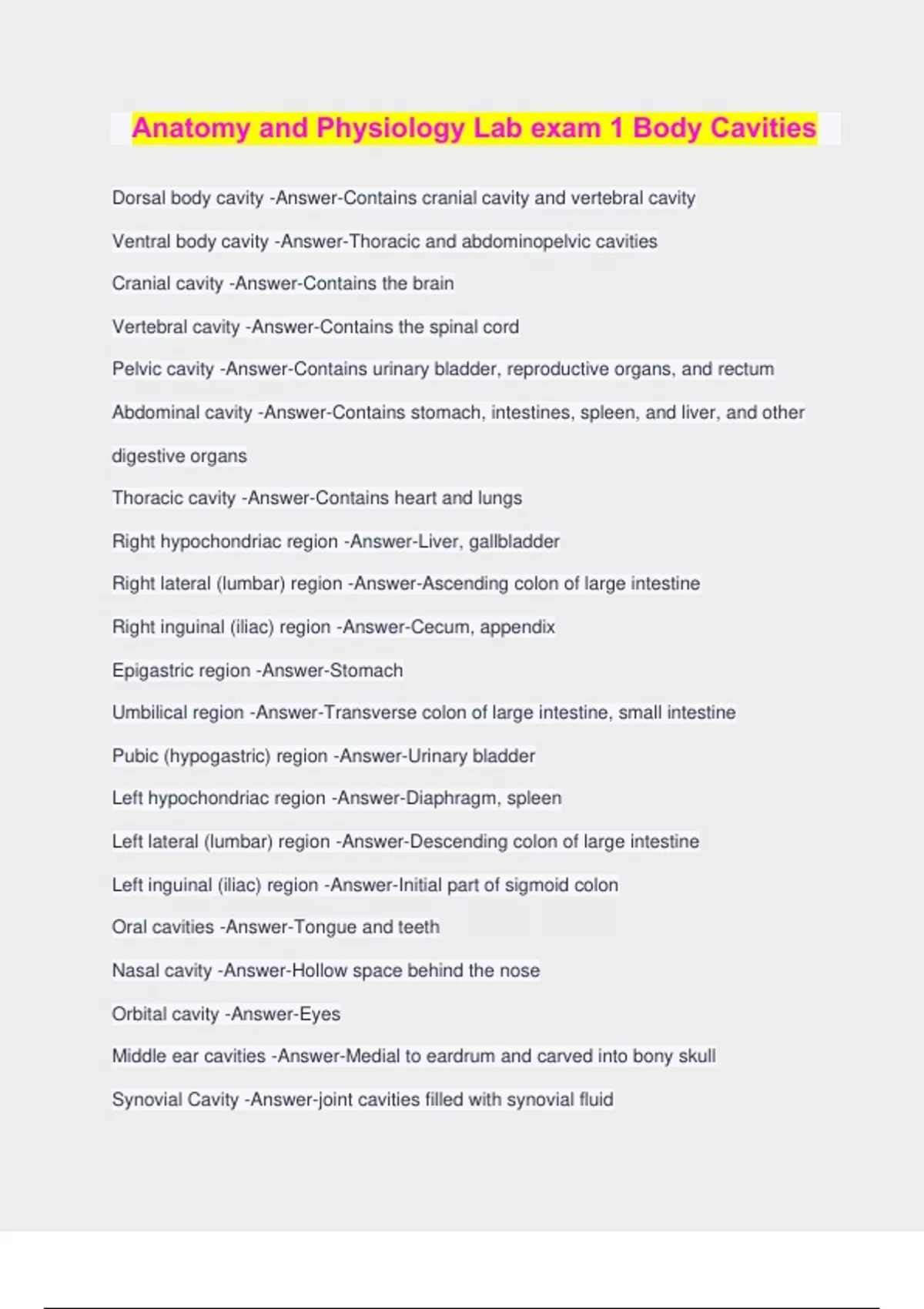 Anatomy and Physiology Lab exam 1 Body Cavities Dorsal body cavity -Answer-Contains cranial cavity and vertebral cavity Ventral body cavity -Answer-Thoracic and abdominopelvic cavities Cranial cavity -Answer-Contains the brain Vertebral cavity -Answer-Contains the spinal cord Pelvic cavity -Answer-Contains urinary bladder, reproductive organs, and rectum Abdominal cavity -Answer-Contains stomach, intestines, spleen, and liver, and other digestive organs
