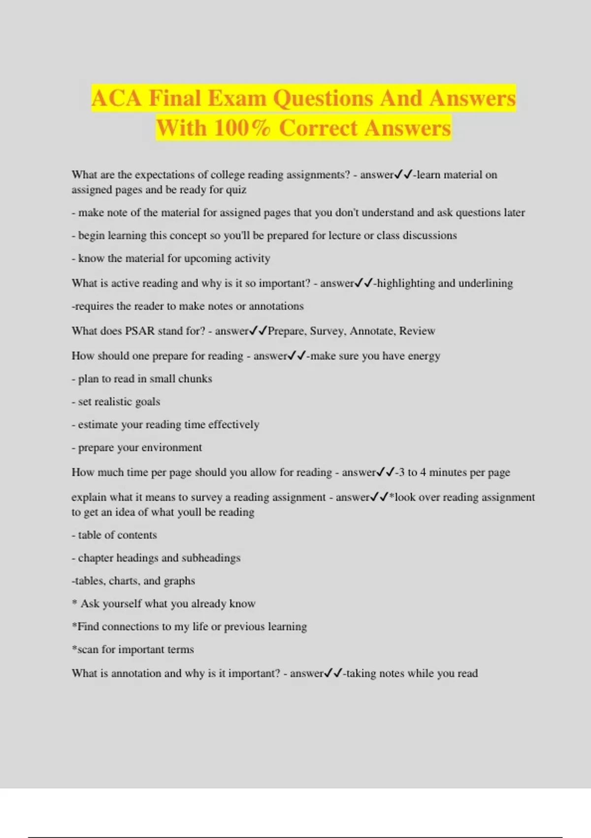 ACA Final Exam Questions And Answers With 100% Correct Answers What are the expectations of college reading assignments? - answer-learn material on assigned pages and be ready for quiz - make note of the material for assigned pages that you don't understand and ask questions later - begin learning this concept so you'll be prepared for lecture or class discussions - know the material for upcoming activity What is active reading and why is it so important? - answer-highlighting and underlining -requires the reader to make notes or annotations What does PSAR stand for? - answerPrepare, Survey, Annotate, Review How should one prepare for reading - answer-make sure you have energy - plan to read in small chunks - set realistic goals - estimate your reading time effectively - prepare your environment How much time per page should you allow for reading - answer-3 to 4 minutes per page explain what it means to survey a reading assignment - answer*look over reading assignment to get an idea of what youll be reading - table of contents - chapter headings and subheadings -tables, charts, and graphs * Ask yourself what you already know *Find connections to my life or previous learning *scan for important terms What is annotation and why is it important? - answer-taking notes while you read -it helps you digest the material by giving specific activities or steps to complete while you read, thereby helping interact and learn the material How does one annotate? - answer-take notes in the book, but can also take notes in a notebook annotate important information - answer- definitions, terms, significant examples, helpful diagrams - box key terms, star examples, circle helpful diagrams When should you take notes while in class and what should you make note of (SOARS) - answer-during a class discussion- write down questions, answers, and responses -student led presentations- instructor's questions or comments or summaries or stressed points - explanations of assignments- guidance or tips, explanations, remarks about past classes, performances - Demonstrations- procedural steps, tips or pointers, explanations Explain the most effective way to take notes before, during and after class - answer explain the informal outline - answerWhen you write an outline that highlights main ideas and then bullet poi