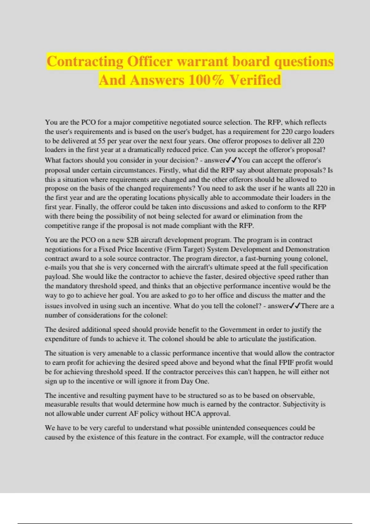 Contracting Officer warrant board questions And Answers 100% Verified You are the PCO for a major competitive negotiated source selection. The RFP, which reflects the user's requirements and is based on the user's budget, has a requirement for 220 cargo loaders to be delivered at 55 per year over the next four years. One offeror proposes to deliver all 220 loaders in the first year at a dramatically reduced price. Can you accept the offeror's proposal? What factors should you consider in your decision? - answerYou can accept the offeror's proposal under certain circumstances. Firstly, what did the RFP say about alternate proposals? Is this a situation where requirements are changed and the other offerors should be allowed to propose on the basis of the changed requirements? You need to ask the user if he wants all 220 in the first year and are the operating locations physically able to accommodate their loaders in the first year. Finally, the offeror could be taken into discussions and asked to conform to the RFP with there being the possibility of not being selected for award or elimination from the competitive range if the proposal is not made compliant with the RFP. You are the PCO on a new $2B aircraft development program. The program is in contract negotiations for a Fixed Price Incentive (Firm Target) System Development and Demonstration contract award to a sole source contractor. The program director, a fast-burning young colonel, e-mails you that she is very concerned with the aircraft's ultimate speed at the full specification payload. She would like the contractor to achieve the faster, desired objective speed rather than the mandatory threshold speed, and thinks that an objective performance incentive would be the way to go to achieve her goal. You are asked to go to her office and discuss the matter and the issues involved in using such an incentive. What do you tell the colonel? - answerThere are a number of considerations for the colonel: The desired additional speed should provide benefit to the Government in order to justify the expenditure of funds to achieve it. The colonel should be able to articulate the justification. The situation is very amenable to a classic performance incentive that would allow the contractor to earn profit for achieving the desired speed above and beyond what the final FPIF profit would be for achieving threshold speed. If the contractor perceives this can't happen, he will either not sign up to the incentive or will ignore it from Day One. The incentive and resulting payment have to be structured so as to be based on observable, measurable results that would determine how much is earned by the contractor. Subjectivity is not allowable under current AF policy without HCA approval. We have to be very careful to understand what possible unintended consequences could be caused by the existence of this feature in the contract. For example, will the contractor reduce aircraft weight beyond safe limits in order to help achieve the payment? Also, will the contractor consume excessive schedule to get the extra speed? There has to be a cost incentive in place so that the contractor doesn't spend an unconstrained amount of money to win the payment, such as under a CPFF contract. The FPIF share line serves this purpose when balanced against the incentive. The incentive has to be balanced with the FPIF share line so that the contractor doesn't spend more money to achieve the desired speed than he has potential to earn by receiving the payment. Similarly, the contractor can't be allowed to spend an excessive amount of money with little cost penalty to achieve success. In some cases, Contracting Officers are also Grants Officers. They can award Grants and Assistance Instruments as well as contracts. What is Assistance? How does it differ from Acquisition? What gives the Grants Officers their authority to enter into assistance? What are the types of Assistance? - answerWhen the principal purpose is to transfer a thing of value, to carry out a public purpose of support or stimulation authorized by law of the United States, it is Assistance. Acquisition, by contrast, has the principal purpose of acquiring property or services for the direct benefit or use of the United States Government. Federal agencies must be authorized by statute to support or stimulate a public purpose. The statutory authority from Congress must exist either in broad legislation or in a program-specific statute. Absent that statutory authority, a Grants Officer may not use an assistance instrument. Authorities to issue Assistance can be of three types: (1) Provide to the Secretary of Defense by statute, e.g., 10 U.S.C. 2391; (2) Authority provided to DoD components that requires no delegation by the Secretary of Defense, e.g., 10 U.S.C. 2358; (3) Authority coming indirectly from statutes, i.e., federal statute authorizing a program that is consistent with using a grant or cooperative agreement. Two types of Assistance are Grants and Cooperative Agreements. They differ in the following way: In a Grant, substantial involvement is not expected between the agency and the recipient. In Cooperative Agreement, substantial involvement is expected between the agency and the recipient. Cooperative Agreements, then, are particularly useful in the research arena when the Government is interested in being involved in program decisions or may be doing some testing or research themselves. You are the Contracting Officer on a new Research and Development program. Proposals were recently received in response to a Broad Agency Announcement, and a Cost Plus Fixed Fee contract type is anticipated. The proposal most favored by the technical team was priced significantly under what was estimated for the effort. The contractor proposed fee in an amount that equates to 20% of the estimated cost. The users have more than enough funds to cover the proposal and want you to accept the price as is. How should you advi