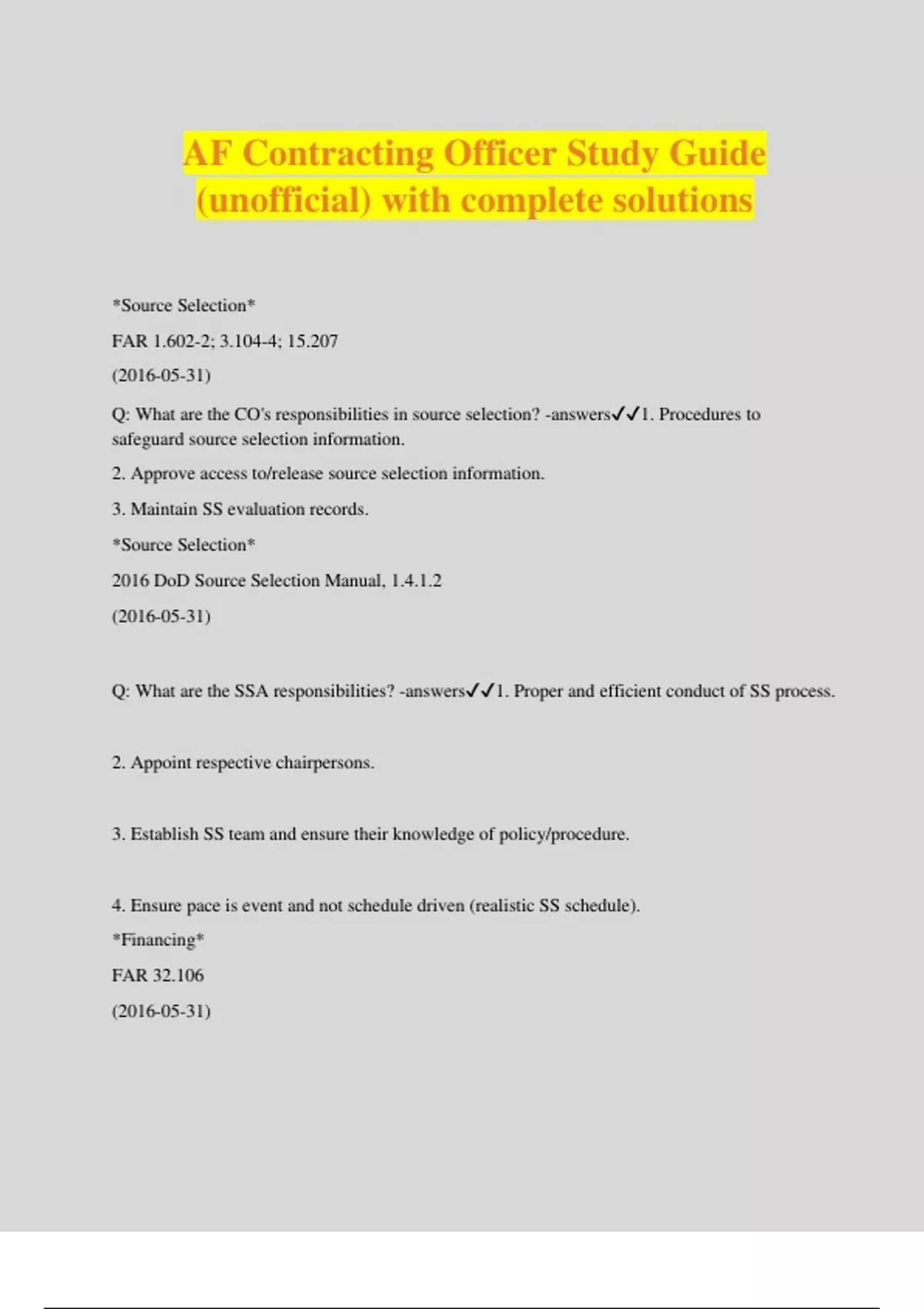 AF Contracting Officer Study Guide (unofficial) with complete solutions *Source Selection* FAR 1.602-2; 3.104-4; 15.207 () Q: What are the CO's responsibilities in source selection? -answers1. Procedures to safeguard source selection information. 2. Approve access to/release source selection information. 3. Maintain SS evaluation records. *Source Selection* 2016 DoD Source Selection Manual, 1.4.1.2 () Q: What are the SSA responsibilities? -answers1. Proper and efficient conduct of SS process. 2. Appoint respective chairpersons. 3. Establish SS team and ensure their knowledge of policy/procedure. 4. Ensure pace is event and not schedule driven (realistic SS schedule). *Financing* FAR 32.106 () Q: Name the different types of government financing in order of their preference -answers1. Private financing (most preferred). 2. Performance based payments. 3. Customary progress payments. 4. Guaranteed loans. 5. Unusual progress payments. 6. Advance payments (least preferred). *Acquisition Strategy Panel (ASP)* AFFARS 5307.104-92; AFICA MP 5307.104-92 () Q: Who prepares the ASP minutes, when are they prepared and who approves them? *AIR FORCE ONLY* -answersProgram manager, CO or Commodity Council Director prepares following the conclusion of the ASP briefing, and approved by the ASP chairperson. *Cost Analysis* FAR 15.404-1 (c) () Q: What is cost analysis? -answersReview and evaluation of separate elements and profit of contractor's proposal. The application of judgment to determine how well proposed costs represent what the cost of the contract should be assuming reasonable economy and efficiency. Techniques include verification of cost or pricing data and evaluation of cost elements; projection of offeror's cost trends based on current/historical cost/pricing data; audit and negotiated indirect cost, labor and COM rates. *IDIQ* FAR 16.504 (a) () Q: How does the PCO compute the minimum and maximum quantity on an IDIQ contract? - answers1. Minimum-Should be more than a nominal quantity but should not exceed amount the Government is fairly certain to order. 2. Maximum - A reasonable max should be established by conducting market research trends on recent contracts for similar supply/svcs, survey of potential users, other rational basis. *Estimating Systems* FAR 15.407-5 () Q: Define estimating system and cost reimbursement. -answersEstimating system is contractor's policies/procedures/practices for generating estimates. Includes organizational structure, internal controls, and managerial reviews, work flow, est methods, techniques, accumulation of historical costs and other analysis. Cost reimbursement - Contractor's ability to accurately and reliable estimate costs could lead to cost overruns and increased risk for the Government. *Defective Pricing* FAR 15.407-1 () Q: What are six conditions which must exist to have defective pricing? -answers1. Information fits the definition of cost and pricing data. 2. Accurate data was available to the contractor before the agreement on price. 3. Data was not accurate, current, complete as of date of agreement. 4. Data was not submitted to CO. 5. Government must have relied on the data. 6. An increase in cost as a result of Government reliance on the data. *Contract Elements* Common Law () Q: What are the essential elements of a contract? -answers1. Offer. 2. Acceptance. 3. Consideration. 4. Lawful purpose. 5. Competency of parties. 6. Certainty of terms. *Economy Act* 31 U.S.C. 1535; FAR 17.502-2 () Q: Describe the Economy Act -answersAllows agencies to procure goods/services from other agencies at cost, a D&F is required. Intra-agency, activity within the Dod, you may not need D&F, Inter-agency, activity outside DoD like DOE, D&F signed by General or SES. Economy act does not apply to FSS acquisitions under FAR 8 or GSA, FPI, and other required sources of supplies. *Contract Award* FAR 32.703-2 () Q: You have just completed a long and complex negotiation for a large IDIQ contract and are ready to make award. In terms of funding, what must you ensure before awarding this contract? - answersSufficient funds are available to be obligated for minimum order quantity. *Funds* DoD Financial Management Regulation, Volume 3, Chapter 10, Appendix C () Q: When speaking of funds, what does "Current", "Expired", and "Cancelled" funds mean? - answers1. Current - funds available for obligation. 2. Expired - funds available only for rec