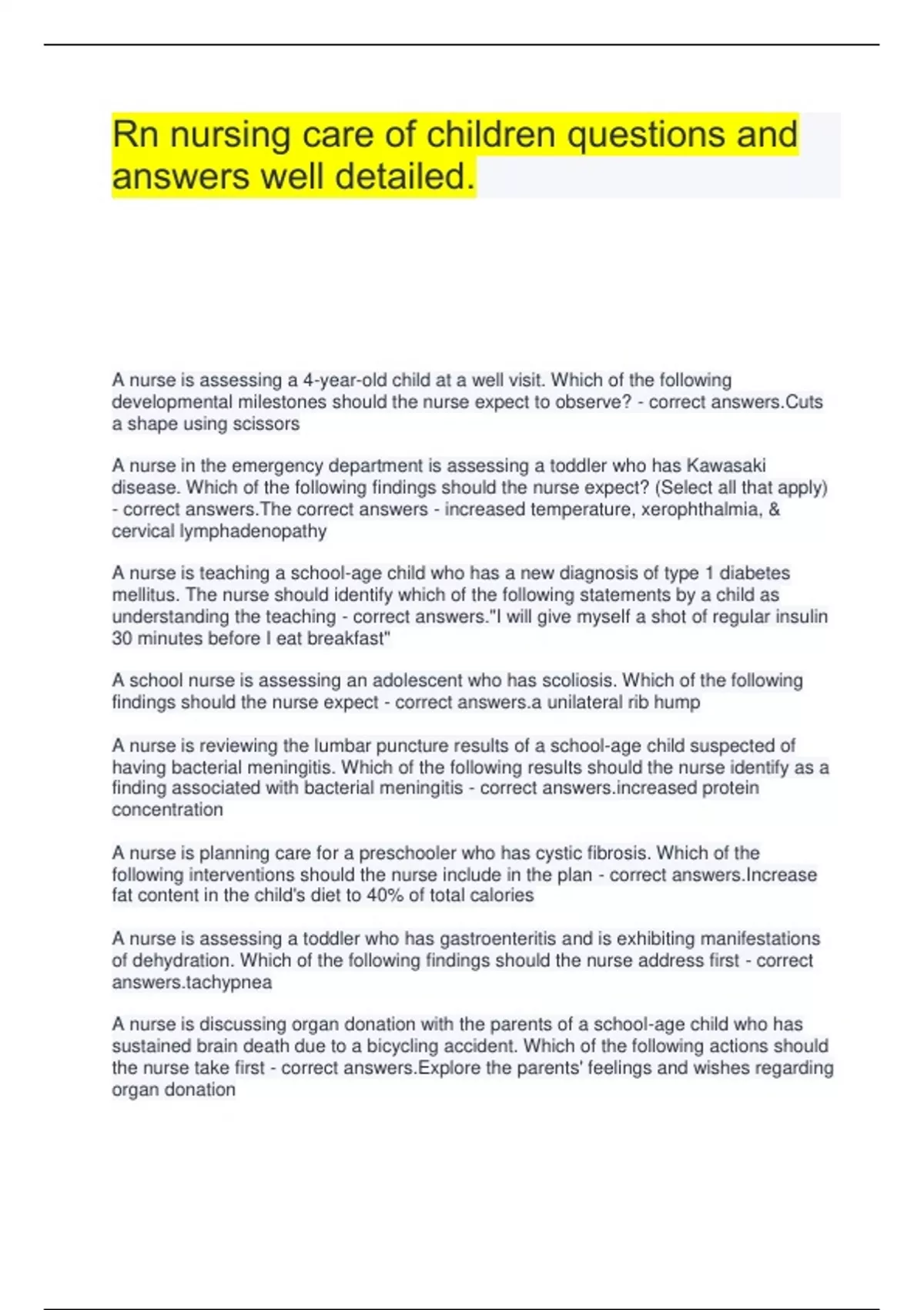 Rn nursing care of children questions and answers well detailed. A nurse is assessing a 4-year-old child at a well visit. Which of the following developmental milestones should the nurse expect to observe? - correct answers.Cuts a shape using scissors A nurse in the emergency department is assessing a toddler who has Kawasaki disease. Which of the following findings should the nurse expect? (Select all that apply) - correct answers.The correct answers - increased temperature, xerophthalmia, & cervical lymphadenopathy A nurse is teaching a school-age child who has a new diagnosis of type 1 diabetes mellitus. The nurse should identify which of the following statements by a child as understanding the teaching - correct answers."I will give myself a shot of regular insulin 30 minutes before I eat breakfast" A school nurse is assessing an adolescent who has scoliosis. Which of the following findings should the nurse expect - correct answers.a unilateral rib hump A nurse is reviewing the lumbar puncture results of a school-age child suspected of having bacterial meningitis. Which of the following results should the nurse identify as a finding associated with bacterial meningitis - correct ased protein concentration A nurse is planning care for a preschooler who has cystic fibrosis. Which of the following interventions should the nurse include in the plan - correct answers.Increase fat content in the child's diet to 40% of total calories A nurse is assessing a toddler who has gastroenteritis and is exhibiting manifestations of dehydration. Which of the following findings should the nurse address first - correct pnea A nurse is discussing organ donation with the parents of a school-age child who has sustained brain death due to a bicycling accident. Which of the following actions should the nurse take first - correct answers.Explore the parents' feelings and wishes regarding organ donation A nurse in an emergency department is caring for a school-age child who has appendicitis and rates his abdominal pain at 7 on a 0 to 10 scale. Which of the following actions should the nurse take - correct answers.Give morphine 0.05mg/kg IV A nurse is monitoring the oxygen saturation level of an infant using pulse oximetry. The nurse should secure the sensor to which of the following areas on the infant - correct toe A nurse is reviewing laboratory results of a school-age child who is 1 week postoperative following an open fracture repair. Which of the following values should the nurse identify as an indication of a potential complication - correct answers.Erythrocyte sedimentation rate 18 mm/hr A school nurse is assessing a school-age child who has erythema infectiosum (fifth disease). Which of the following findings should the nurse expect - correct answers.Facial rash A hospice nurse is caring for a preschooler who has a terminal illness. The father tells the nurse that he cannot cope anymore and has decided to move out of the house. Which of the following statements should the nurse make - correct answers."Let's talk about some of the ways you have handled previous stressors in your life" A nurse is teaching a group of parents about infectious mononucleosis. Which of the following statements by a parent should the nurse identify as understanding the teaching - correct answers."Mononucleosis is caused by an infection with the Epstein-Barr virus" A nurse in an emergency department suspects that a toddler has epiglottitis. Which of the following actions should the nurse take - correct answers.Prepare the toddler for nasotracheal intubation A nurse is caring for a toddler who has acute otitis media and a temperature of 40 degrees C (104 degrees C). After administering acetaminophen, which of the following actions should the nurse plan to take to reduce the toddlers temperature - correct answers.Dress the toddler in minimal clothing A nurse is assessing an infant who has a ventricular septal defect. Which of the following findings should the nurse expect - correct harsh murmur A nurse is providing discharge teaching to a parent of a school-age child who has undergone tonsillectomy. Which of the following statements by the parent should the nurse identify as understanding the teaching - correct answers."I will notify the doctor if I notice that my child is swallowing frequently"