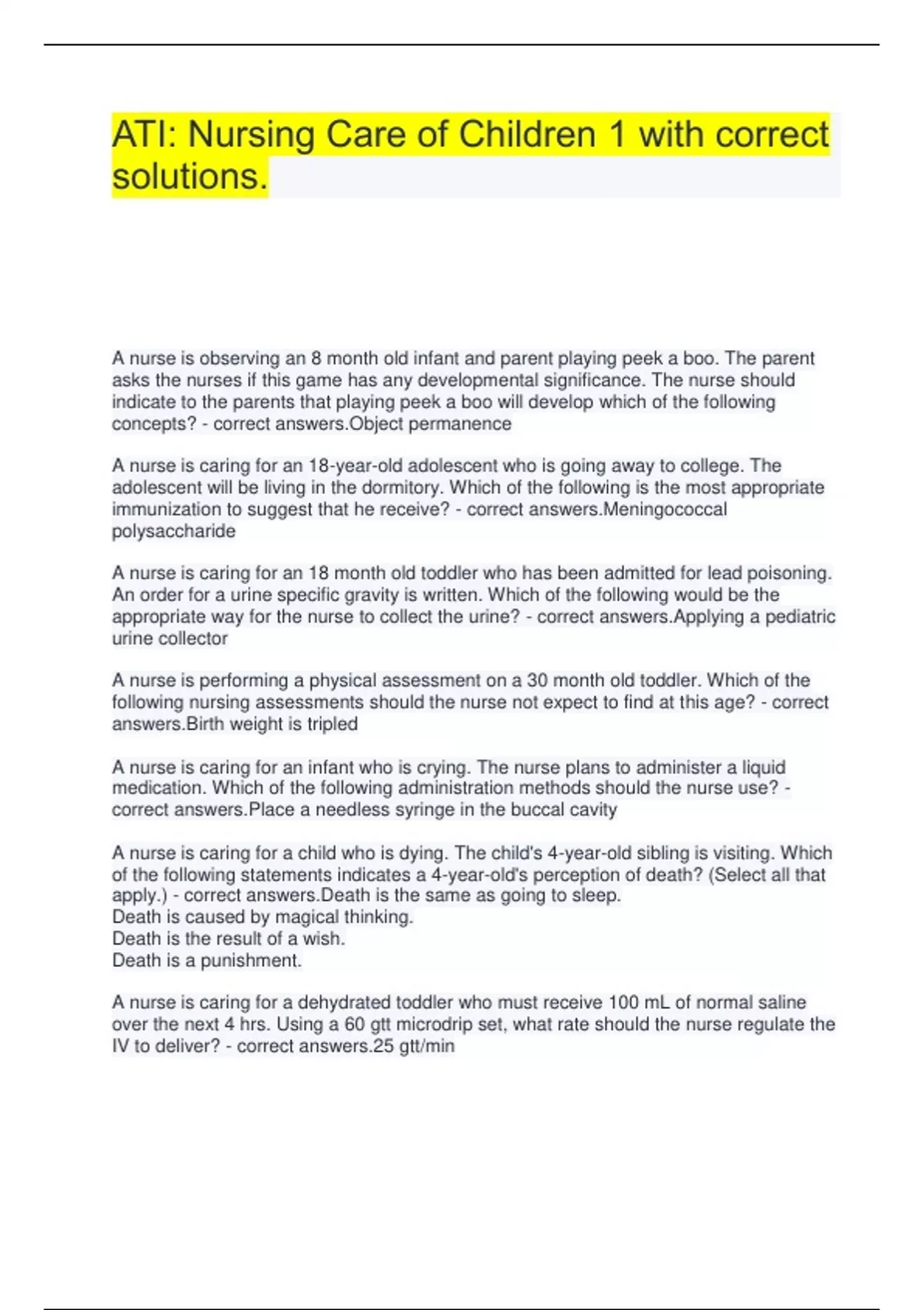 ATI: Nursing Care of Children 1 with correct solutions. A nurse is observing an 8 month old infant and parent playing peek a boo. The parent asks the nurses if this game has any developmental significance. The nurse should indicate to the parents that playing peek a boo will develop which of the following concepts? - correct answers.Object permanence A nurse is caring for an 18-year-old adolescent who is going away to college. The adolescent will be living in the dormitory. Which of the following is the most appropriate immunization to suggest that he receive? - correct answers.Meningococcal polysaccharide A nurse is caring for an 18 month old toddler who has been admitted for lead poisoning. An order for a urine specific gravity is written. Which of the following would be the appropriate way for the nurse to collect the urine? - correct answers.Applying a pediatric urine collector A nurse is performing a physical assessment on a 30 month old toddler. Which of the following nursing assessments should the nurse not expect to find at this age? - correct answers.Birth weight is tripled A nurse is caring for an infant who is crying. The nurse plans to administer a liquid medication. Which of the following administration methods should the nurse use? - correct answers.Place a needless syringe in the buccal cavity A nurse is caring for a child who is dying. The child's 4-year-old sibling is visiting. Which of the following statements indicates a 4-year-old's perception of death? (Select all that apply.) - correct answers.Death is the same as going to sleep. Death is caused by magical thinking. Death is the result of a wish. Death is a punishment. A nurse is caring for a dehydrated toddler who must receive 100 mL of normal saline over the next 4 hrs. Using a 60 gtt microdrip set, what rate should the nurse regulate the IV to deliver? - correct answers.25 gtt/min