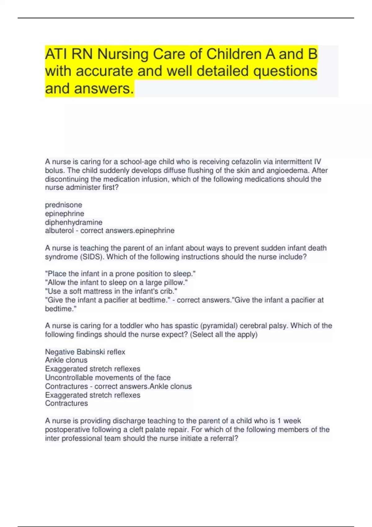 ATI RN Nursing Care of Children A and B with accurate and well detailed questions and answers. A nurse is caring for a school-age child who is receiving cefazolin via intermittent IV bolus. The child suddenly develops diffuse flushing of the skin and angioedema. After discontinuing the medication infusion, which of the following medications should the nurse administer first? prednisone epinephrine diphenhydramine albuterol - correct phrine A nurse is teaching the parent of an infant about ways to prevent sudden infant death syndrome (SIDS). Which of the following instructions should the nurse include? "Place the infant in a prone position to sleep." "Allow the infant to sleep on a large pillow." "Use a soft mattress in the infant's crib." "Give the infant a pacifier at bedtime." - correct answers."Give the infant a pacifier at bedtime." A nurse is caring for a toddler who has spastic (pyramidal) cerebral palsy. Which of the following findings should the nurse expect? (Select all the apply) Negative Babinski reflex Ankle clonus Exaggerated stretch reflexes Uncontrollable movements of the face Contractures - correct answers.Ankle clonus Exaggerated stretch reflexes Contractures A nurse is providing discharge teaching to the parent of a child who is 1 week postoperative following a cleft palate repair. For which of the following members of the inter professional team should the nurse initiate a referral? occupational therapist speech therapist respiratory therapist physical therapist - correct h therapist A nurse is creating a plan of care for an infant who has an epidural hematoma from a head injury. Which of the following interventions should the nurse include in the plan? Position the infant side-lying with their head at a 0° to 5° angle. Perform a neurological assessment every 4 hr. Suction the infant's naers to remove secretions. Implement seizure precautions for the infant. - correct answers.Implement seizure precautions for the infant. A nurse is preparing an adolescent for a lumbar puncture. Which of the following actions should the nurse take? Place a cardiac monitor on the adolescent prior to the procedure. Apply topical analgesic cream to the site 1hr prior to the procedure. Keep the adolescent in a semi-fowler's position for 4hrs following the procedure. Restrict fluids for 2hrs following procedure. - correct answers.Apply topical analgesic cream to the site 1hr prior to the procedure. A nurse is providing teaching to the parent of a school-age child who has a new prescription for oral nystatin for the treatment of oral candidiasis. Which of the following instructions should the nurse include? "Shake the medication prior to administration.". "Provide the medication through a straw." "Rinse the child's mouth with water immediately after giving the medication." "Mix the medication with applesauce if the child dislikes the taste." - correct answers."Shake the medication prior to administration." A nurse in an emergency department is performing a physical assessment on a 2 week old male newborn. Which of the following findings is priority for the nurse to report to the provider? excoriated scrotal area multiple capillary hemangiomas depressed posterior fontanel substernal retractions - correct ernal retractions A nurse is receiving change-of-shift report on four children. Which of the following children should the nurse see first? A school age child who has sickle cell anemia and reports decreased vision in the left eye. School age child who has cystic fibrosis and a frequent nonproductive cough. A preschooler who has asthma and a peak flow meter reading in the green zone. An adolescent who has meningitis and reports a sensitivity to lights and noise. - correct answers.A school age child who has sickle cell anemia and reports decreased vision in the left eye. A nurse is assessing a school-age child who has meningitis. Which of the following findings is the priority for the nurse to report to the provider? Reports a headache as 6 on a 0 to 10 pain scale Petechiae on the lower extremities Nuchal rigidity Positive Kernig's sign - correct answers.Petechiae on the lower extremities A nurse is assessing a 3 year old toddler at a well-child visit. Which of the following manifestations should the nurse report to the provider? Blood pressure 90/50 mm Hg Respiratory rate 45/min Weight 14.5 kg (32lbs) Heart rate 110/min - correct answers.Respiratory rate 45/min A nurse is reviewing the laboratory report of a school-age child who is experiencing fatigue. Which of the following findings should the nurse recognize as an indication of anemia? Hematocrit 28% Hemoglobin 13.5 g/dL WBC count 8,000 Platelets 250,000 - correct answers.Hematocrit 28% A nurse is planning care for a school-age child who is in the oliguric phase of acute kidney injury (AKI) and has a sodium level of 129 mEq/L. Which of the following interventions should the nurse include in the plan? Administer ibuprofen to the child for a temperature greater than 38° C (100.4° F). Assess the child's blood pressure every 8hr.