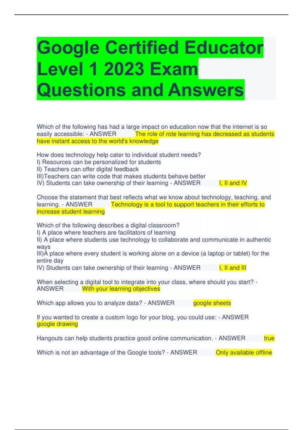 Google Certified Educator Level 1 2023 Exam Questions and Answers Which of the following has had a large impact on education now that the internet is so easily accessible: - ANSWER The role of rote learning has decreased as students have instant access to the world's knowledge How does technology help cater to individual student needs? I) Resources can be personalized for students II) Teachers can offer digital feedback III)Teachers can write code that makes students behave better IV) Students can take ownership of their learning - ANSWER I, II and IV Choose the statement that best reflects what we know about technology, teaching, and learning. - ANSWER Technology is a tool to support teachers in their efforts to increase student learning Which of the following describes a digital classroom? I) A place where teachers are facilitators of learning II) A place where students use technology to collaborate and communicate in authentic ways III)A place where every student is working alone on a device (a laptop or tablet) for the entire day IV) Students can take ownership of their learning - ANSWER I, II and III When selecting a digital tool to integrate into your class, where should you start? - ANSWER With your learning objectives Which app allows you to analyze data? - ANSWER google sheets If you wanted to create a custom logo for your blog, you could use: - ANSWER google drawing Hangouts can help students practice good online communication. - ANSWER true Which is not an advantage of the Google tools? - ANSWER Only available offline How can image search be used to teach good online behavior? - ANSWER Filter images by usage rights Building _____ helps students cope better when faced with challenges online. - ANSWER Resilience What can all teachers do in their classrooms to help shape responsible students? I) Show students how to create strong passwords II) Provide opportunities for students to practice good behavior III) Create a safe environment for talking about digital citizenship topics IV)Integrate digital citizenship lessons in class - ANSWER I, II and III Which of the following are drawbacks to using a textbook? I)Textbooks can become out of date II) Textbooks don't have interactive components III) Textbooks include graphs and charts IV)Textbooks don't have links to current events - ANSWER I, II and IV One benefit of augmenting a course textbook with digital resources is - ANSWER Increases student engagement Which tool allows a teacher to put together a collection of videos on a specific topic? - ANSWER YouTube playlists In what ways could students become partners with the teacher in augmenting the textbook with digital resources? I) Students could help build a Google Site of current events that link to the curriculum II) Students could suggest YouTube videos that connect to the course content III) Students can role-play events in the curriculum IV)Integrate digital citizenship lessons in class - ANSWER I, II and III Your learning objective is to get students to understand the concept of projection when speaking. Where can you find video resources from professional speakers who record and share their own public performances? - ANSWER youtube Mrs. Jones is a seventh-grade teacher who is focused on making sure her students are doing everything they can to be safe and secure online. They go to the computer lab each week and do a lot of web browsing on sites that she's gathered links for on a shared Google Doc. Students add their own notes and comments below each link as they do their research. They can also add new resources as they find them on the Internet.Answer the following three questions based on this scenario. Which of the following contemporary skills is Mrs. Jones developing in her students? I) Creativity II) Communication III)Collaboration IV)Community - ANSWER II and III Which mode can students use to ensure that their information is not saved in their Chrome browser when they are done in the computer lab each day? - ANSWER incognito What URL should Mrs. Jones give her students if she wanted them to be able to search for more resources? - ANSWER When trying to select the right tool to integrate into your class, you should always start with: - ANSWER the learning goal Parents are looking for guidance on what to tell their children about being safe online. If you could give two simple tips that underlie everything, what would they be? I) Don't download illegally II) Respect yourself and others III) Avoid the first site in the search results IV) Do everything you can to protect yourself - ANSWER II and IV To analyze the data gathered in a Google Form, you should use Google ___. - ANSWER sheets Rather than just reading about a location in a textbook, a great tool to help visualize a location and consider its impact on history would be: - ANSWER google maps When you want to provide your students with the steps for how to do an Advanced Google Search, which of the following is the best place to look first? - ANSWER Google Help Center You recently tried a new activity using Google Sheets with your students and you would like to share it with other teachers. Which of the following is a good place to share your idea with other teachers around the world? - ANSWER Google for Education Help Reforums PLN stands for which of the following: - ANSWER Professional Learning Network When a teacher creates a PLN, her PLN may include which of the following groups of people? - ANSWER All To find your local Google Educator Group (GEG), you can find a list of active groups on the Google Educator Group webpage. - ANSWER True Google Educator Groups are only open to teachers that have passed the Google for Education Level 1 Exam. - ANSWER False