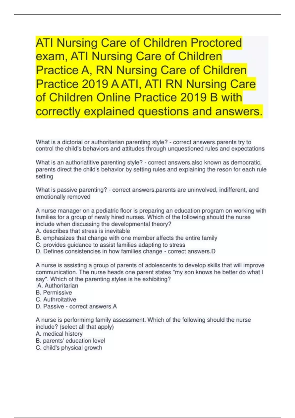 ATI Nursing Care of Children Proctored exam, ATI Nursing Care of Children Practice A, RN Nursing Care of Children Practice 2019 A ATI, ATI RN Nursing Care of Children Online Practice 2019 B with correctly explained questions and answers.
