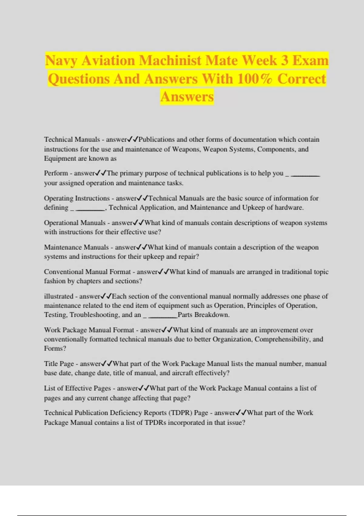 Navy Aviation Machinist Mate Week 3 Exam Questions And Answers With 100% Correct Answers Technical Manuals - answerPublications and other forms of documentation which contain instructions for the use and maintenance of Weapons, Weapon Systems, Components, and Equipment are known as Perform - answerThe primary purpose of technical publications is to help you _ ͟ ͟ ͟ ͟ ͟ ͟ ͟ ͟ ͟ ͟ ͟ ͟ ͟ ͟ _ your assigned operation and maintenance tasks. Operating Instructions - answerTechnical Manuals are the basic source of information for defining _ ͟ ͟ ͟ ͟ ͟ ͟ ͟ ͟ ͟ ͟ ͟ ͟ ͟ ͟ _, Technical Application, and Maintenance and Upkeep of hardware. Operational Manuals - answerWhat kind of manuals contain descriptions of weapon systems with instructions for their effective use? Maintenance Manuals - answerWhat kind of manuals contain a description of the weapon systems and instructions for their upkeep and repair? Conventional Manual Format - answerWhat kind of manuals are arranged in traditional topic fashion by chapters and sections? illustrated - answerEach section of the conventional manual normally addresses one phase of maintenance related to the end item of equipment such as Operation, Principles of Operation, Testing, Troubleshooting, and an _ ͟ ͟ ͟ ͟ ͟ ͟ ͟ ͟ ͟ ͟ ͟ ͟ ͟ ͟ _Parts Breakdown. Work Package Manual Format - answerWhat kind of manuals are an improvement over conventionally formatted technical manuals due to better Organization, Comprehensibility, and Forms? Title Page - answerWhat part of the Work Package Manual lists the manual number, manual base date, change date, title of manual, and aircraft effectively? List of Effective Pages - answerWhat part of the Work Package Manual contains a list of pages and any current change affecting that page? Technical Publication Deficiency Reports (TDPR) Page - answerWhat part of the Work Package Manual contains a list of TPDRs incorporated in that issue? Work Package (WP) 001 00 - answerWhat part of the Work Package Manual contains an alphabetical index of work packages for the entire manual? Work Package (WP) 002 00 (Introduction) - answerWhat part of the Work Package Manual contains purpose, arrangement, reference data, and a list of applicable manuals by system? Work Package 003 00 - answerWhat par