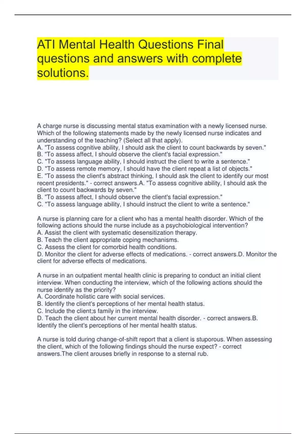 ATI Mental Health Questions Final questions and answers with complete solutions. A charge nurse is discussing mental status examination with a newly licensed nurse. Which of the following statements made by the newly licensed nurse indicates and understanding of the teaching? (Select all that apply). A. "To assess cognitive ability, I should ask the client to count backwards by seven." B. "To assess affect, I should observe the client's facial expression." C. "To assess language ability, I should instruct the client to write a sentence." D. "To assess remote memory, I should have the client repeat a list of objects." E. "To assess the client's abstract thinking, I should ask the client to identify our most recent presidents." - correct answers.A. "To assess cognitive ability, I should ask the client to count backwards by seven." B. "To assess affect, I should observe the client's facial expression." C. "To assess language ability, I should instruct the client to write a sentence." A nurse is planning care for a client who has a mental health disorder. Which of the following actions should the nurse include as a psychobiological intervention? A. Assist the client with systematic desensitization therapy. B. Teach the client appropriate coping mechanisms. C. Assess the client for comorbid health conditions. D. Monitor the client for adverse effects of medications. - correct answers.D. Monitor the client for adverse effects of medications. A nurse in an outpatient mental health clinic is preparing to conduct an initial client interview. When conducting the interview, which of the following actions should the nurse identify as the priority? A. Coordinate holistic care with social services. B. Identify the client's perceptions of her mental health status. C. Include the client;s family in the interview. D. Teach the client about her current mental health disorder. - correct answers.B. Identify the client's perceptions of her mental health status. A nurse is told during change-of-shift report that a client is stuporous. When assessing the client, which of the following findings should the nurse expect? - correct answers.The client arouses briefly in response to a sternal rub. A nurse is planning a peer group discussion about the DSM-5. Which of the following information is appropriate to include in the discussion? (Select all that apply). A. The DSM-5 includes client education handouts for mental health disorders. B. The DSM-5 establishes diagnostic criteria for individual mental health disorders. C. The DSM-5 indicates recommended pharmacological treatment. D. The DSM-5 assists nurses in planning care for clients. E. The DSM-5 indicates expected assessment findings of mental health disorders. - correct answers.B. The DSM-5 establishes diagnostic criteria for individual mental health disorders. C. The DSM-5 indicates recommended pharmacological treatment. D. The DSM-5 assists nurses in planning care for clients. E. The DSM-5 indicates expected assessment findings of mental health disorders. A nurse observes a client who has OCD repeatedly applying, removing, and then reapplying makeup. The nurse identifies that repetitive behavior in a client who has OCD is due to which of the underlying reasons? A. Narcissistic behavior. B. Fear of rejjection from staff C. Attempt to reduce anxiety. D. Adverse effect of antidepressant medication - correct answers.C. Attempt to reduce anxiety. A nurse is caring for a client who is experiencing a panic attack. Which of the following actions should the nurse take? - correct answers.Stay with the client and remain quiet. A nurse is assessing a client who has GAD. Which of the following findings should the nurse expect? (Select all that apply). A. Excessive worry for 6 months. B. Impulsive decision making. C. Delayed reflexes D. Restlessness E. Need for reassurance - correct answers.A. Excessive worry for 6 months. D. Restlessness E. Need for reassurance A nurse is planning care for a client who has body dysmorphic disorder. Which of the following actions should the nurse plan to take first? A. Assessing the client's risk for self harm. B. Instilling hope for positive outcomes. C. Encouraging the client to participate in group therapy sessions. D. Encouraging the client to participate in treatment decisions. - correct answers.A. Assessing the client's risk for self harm. A nurse is caring for a client who has acute stress disorder and is experiencing severe anxiety. Which of the following statements action should the nurse make? A. "Tell me about how you are feeling right now."
