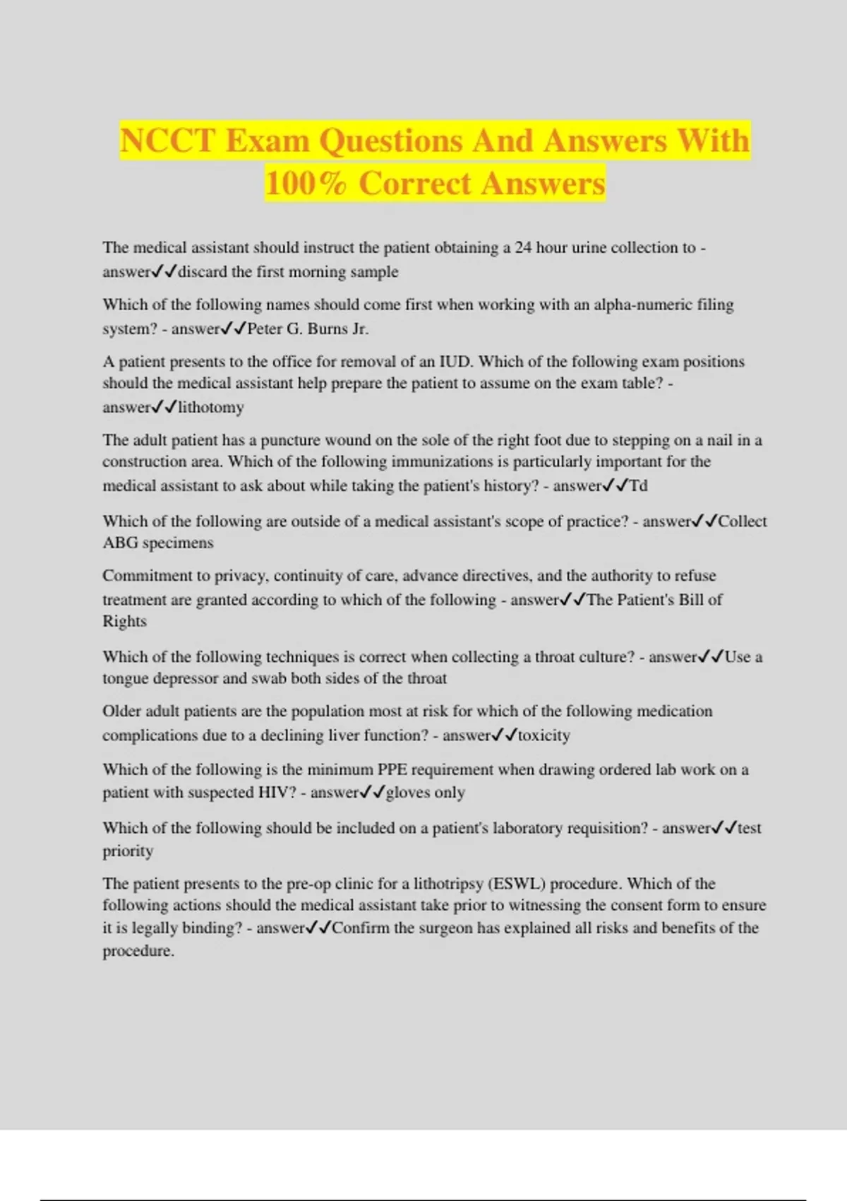 NCCT Exam Questions And Answers With 100% Correct Answers The medical assistant should instruct the patient obtaining a 24 hour urine collection to - answerdiscard the first morning sample Which of the following names should come first when working with an alpha-numeric filing system? - answerPeter G. Burns Jr. A patient presents to the office for removal of an IUD. Which of the following exam positions should the medical assistant help prepare the patient to assume on the exam table? - answerlithotomy The adult patient has a puncture wound on the sole of the right foot due to stepping on a nail in a construction area. Which of the following immunizations is particularly important for the medical assistant to ask about while taking the patient's history? - answerTd Which of the following are outside of a medical assistant's scope of practice? - answerCollect ABG specimens Commitment to privacy, continuity of care, advance directives, and the authority to refuse treatment are granted according to which of the following - answerThe Patient's Bill of Rights Which of the following techniques is correct when collecting a throat culture? - answerUse a tongue depressor and swab both sides of the throat Older adult patients are the population most at risk for which of the following medication complications due to a declining liver function? - answertoxicity Which of the following is the minimum PPE requirement when drawing ordered lab work on a patient with suspected HIV? - answergloves only Which of the following should be included on a patient's laboratory requisition? - answertest priority The patient presents to the pre-op clinic for a lithotripsy (ESWL) procedure. Which of the following actions should the medical assistant take prior to witnessing the consent form to ensure it is legally binding? - answerConfirm the surgeon has explained all risks and benefits of the procedure. A parent calls the pediatrician's office very upset because her child is vomiting and has a temperature of 103.3 F. The medical assistant should - answerschedule a same day work-in appointment. Which of the following insurance programs covers active duty military personnel? - answerTRICARE Which of the following actions is an example of compliance with Quality Control (QC) guidelines for phlebotomy? - answerCheck controls on urinalysis dipsticks daily. Which of the following organizations makes on-site visits to inspect medical office laboratories? - answerCLIA Which of the following blood components are visible in a centrifuged, evacuated red top tube? (Select all that apply.) - answerblood clot, serum The physician orders the following blood work to evaluate a patient for sepsis: CBC, Blood Culture, and BMP. When using the evacuated tube method for venipuncture, in which of the following orders should the tubes be drawn? - answerblood culture, red top, lavender top A patient informs the medical assistant that he is on a low carbohydrate diet and typically eats two hamburger patties daily for lunch and a steak for dinner. Which of the following is the most likely long term outcome of the patient's diet? - answerhyperlipidemi