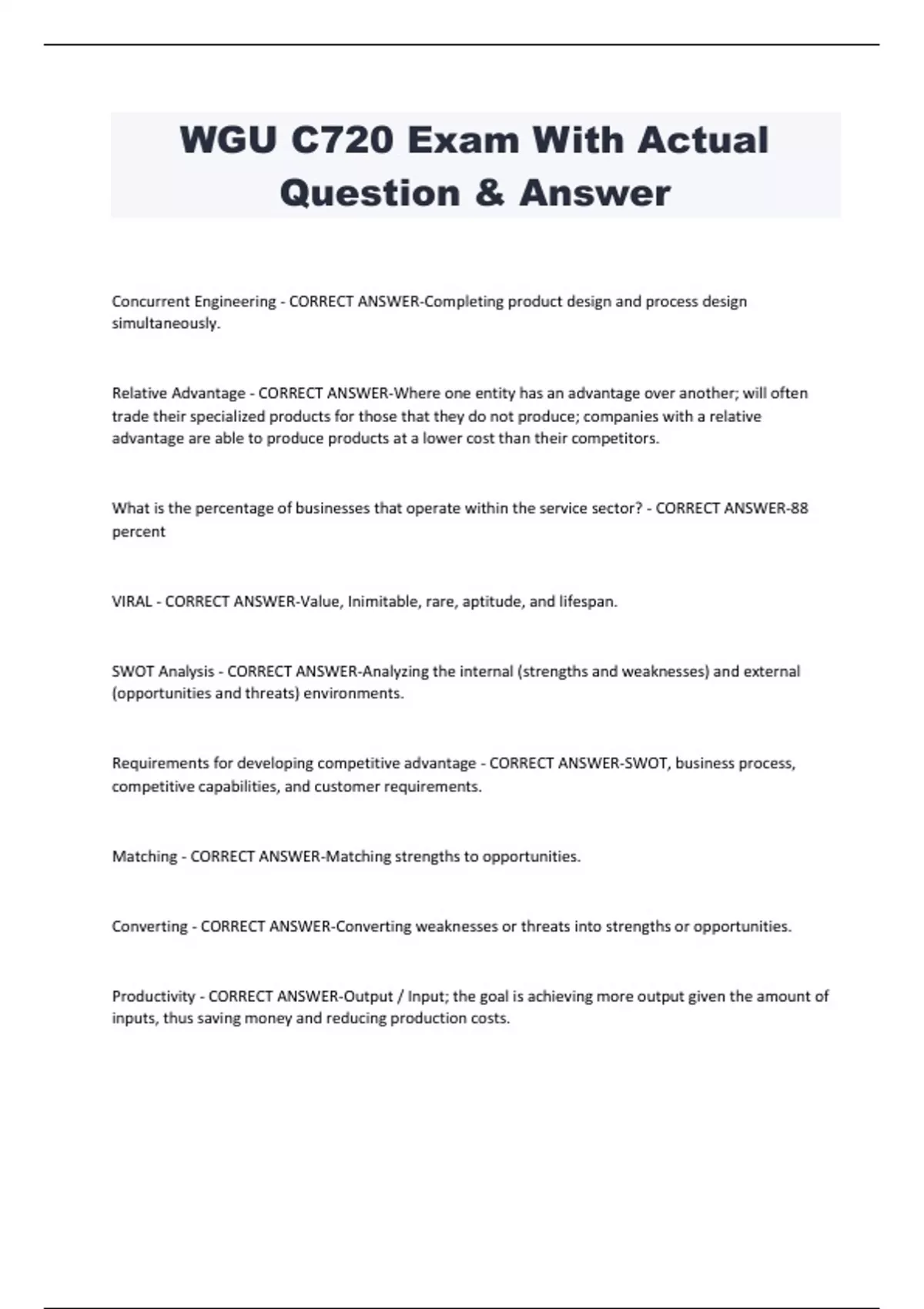 WGU C720 Exam With Actual Question & Answer Concurrent Engineering - CORRECT ANSWER-Completing product design and process design simultaneously. Relative Advantage - CORRECT ANSWER-Where one entity has an advantage over another; will often trade their specialized products for those that they do not produce; companies with a relative advantage are able to produce products at a lower cost than their competitors. What is the percentage of businesses that operate within the service sector? - CORRECT ANSWER-88 percent