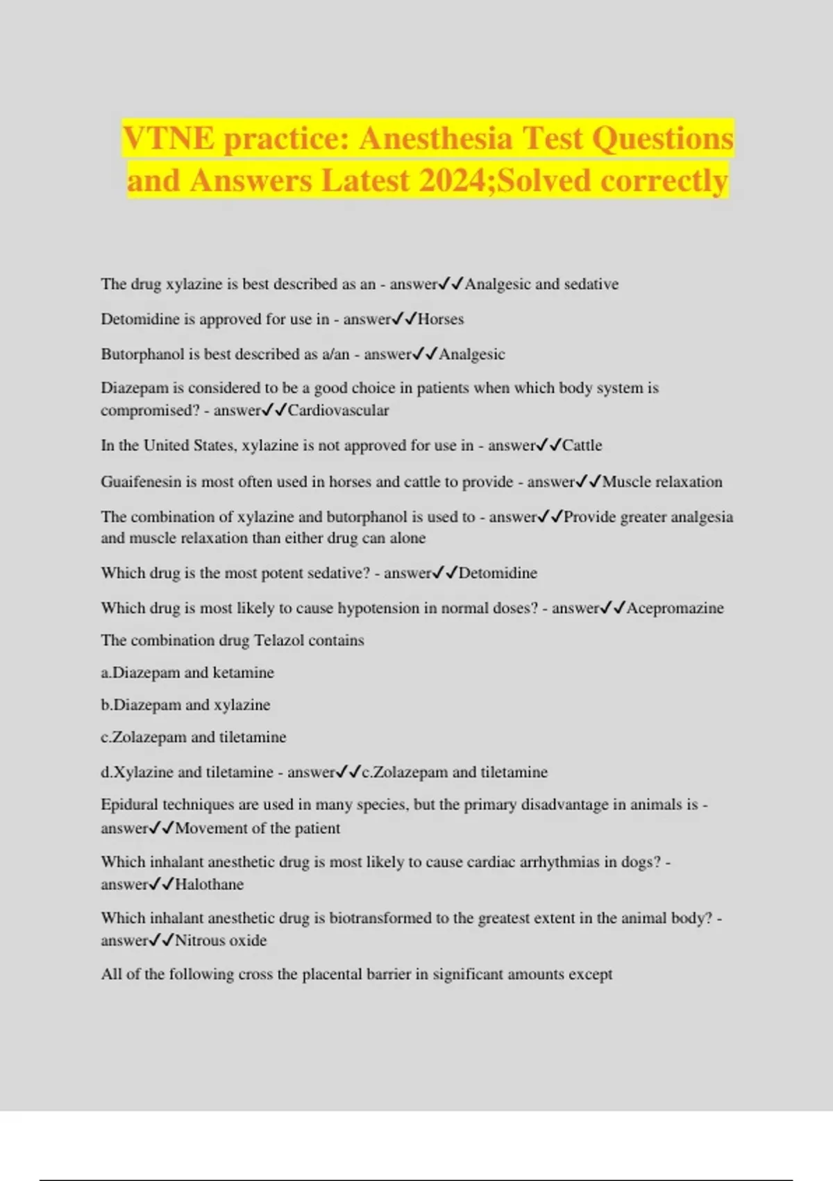 VTNE practice: Anesthesia Test Questions and Answers Latest 2024;Solved correctly The drug xylazine is best described as an - answerAnalgesic and sedative Detomidine is approved for use in - answerHorses Butorphanol is best described as a/an - answerAnalgesic Diazepam is considered to be a good choice in patients when which body system is compromised? - answerCardiovascular In the United States, xylazine is not approved for use in - answerCattle Guaifenesin is most often used in horses and cattle to provide - answerMuscle relaxation The combination of xylazine and butorphanol is used to - answerProvide greater analgesia and muscle relaxation than either drug can alone Which drug is the most potent sedative? - answerDetomidine Which drug is most likely to cause hypotension in normal doses? - answerAcepromazine The combination drug Telazol contains a.Diazepam and ketamine b.Diazepam and xylazine c.Zolazepam and tiletamine d.Xylazine and tiletamine - answerc.Zolazepam and tiletamine Epidural techniques are used in many species, but the primary disadvantage in animals is - answerMovement of the patient Which inhalant anesthetic drug is most likely to cause cardiac arrhythmias in dogs? - answerHalothane Which inhalant anesthetic drug is biotransformed to the greatest extent in the animal body? - answerNitrous oxide All of the following cross the placental barrier in significant amounts except a.Acepromazine b.Diazepam c.Isoflurane d.Neuromuscular blocking agents - answerd.Neuromuscular blocking agents Which drug is not classified as a barbiturate? a.Phenobarbital b.Thiopental c.Pentobarbital d.Propofol - answerd.Propofol Glycopyrrolate is an anticholinergic with all of the following advantages over atropine except a.Longer duration of action b.Crosses the placental barrier c.Less likely to cause cardiac arrhythmias d.Smaller dose volume - answerb. Crosses the placental barrier At normal doses, what effect does atropine have on the heart rate? - answerPrevents a decrease Opioid drugs are used in anesthetic protocols primarily as - answerAnalgesics The advantage of xylazine over acepromazine is that it - answerProduces a short period of analgesia Routine use of atropine in horses should be avoided, because it may - answerCause colic Which drug should be avoided in the stallion because it may cause permanent prolapse of the penis? - answerAcepromazine Which drug is a narcotic antagonist? - answerNaloxone A 10% solution of thiopental sodium for anesthetic induction contains - answer100 mg/ml Depressant preanesthetic medication may have what effect on the anesthesia procedure? - answerProlong the recovery time Which drug is an antagonist of xylazine? - answerYohimbine Diazepam is used to produce - answerMuscle relaxation Epinephrine increases - answerthe heart rate Use of nitrous oxide in anesthesia - answerDecreases the amount of inhalation anesthetic required A disadvantage of breathing 50% nitrous oxide is that it - answerDecreases the arterial PaO2 How many milligrams per milliliter (mg/ml) does a 2% lidocaine solution contain? - answer20 What volume of thiopental sodium should be administered intravenously to a 500-kg horse for induction of anesthesia? The dosage is 8 mg/kg, and you are using a 10% solution. - answer40 ml Apneustic breathing patterns are frequently seen in cats with use of - answerKetamine Which of the following is not a good reason to use a preanesthetic? a.Calms the patient b.Minimizes the dose of induction agent needed c.Smoothes induction and rec