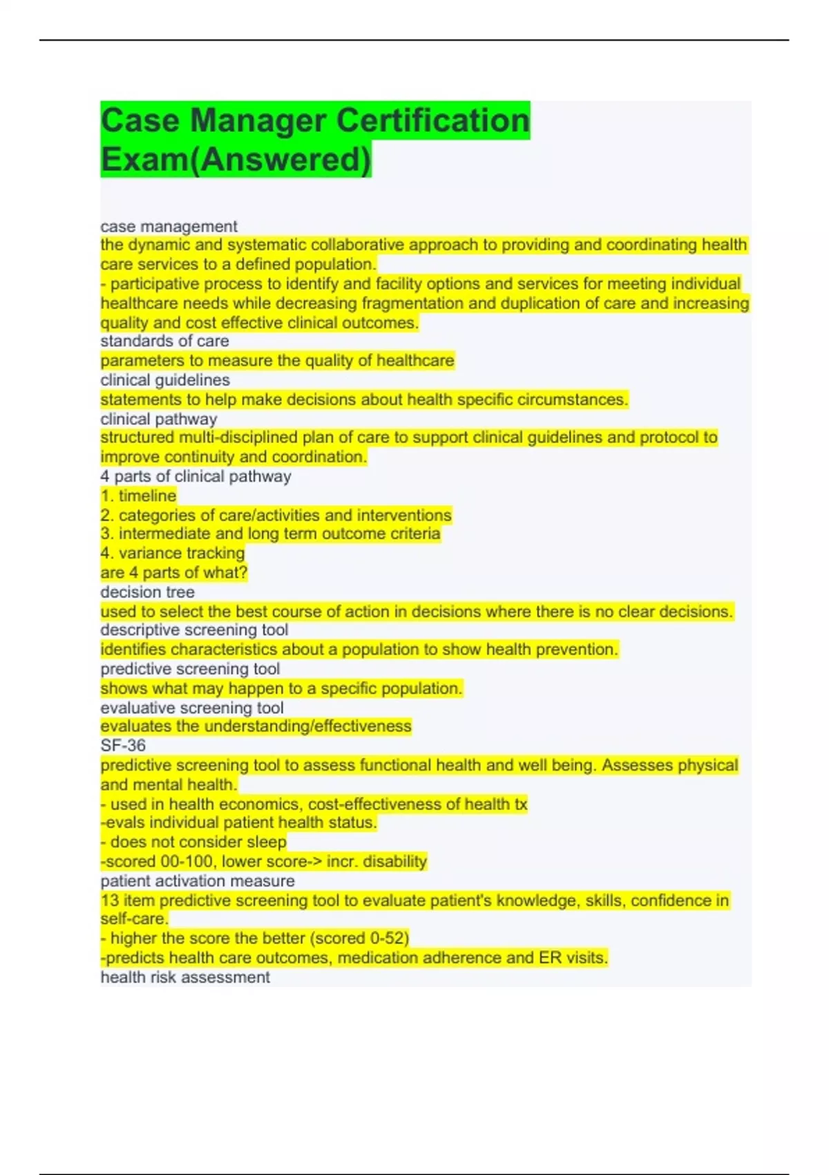 Case Manager Certification Exam(Answered) case management the dynamic and systematic collaborative approach to providing and coordinating health care services to a defined population. - participative process to identify and facility options and services for meeting individual healthcare needs while decreasing fragmentation and duplication of care and increasing quality and cost effective clinical outcomes. standards of care parameters to measure the quality of healthcare clinical guidelines statements to help make decisions about health specific circumstances. clinical pathway structured multi-disciplined plan of care to support clinical guidelines and protocol to improve continuity and coordination. 4 parts of clinical pathway 1. timeline 2. categories of care/activities and interventions 3. intermediate and long term outcome criteria 4. variance tracking are 4 parts of what? decision tree used to select the best course of action in decisions where there is no clear decisions. descriptive screening tool identifies characteristics about a population to show health prevention. predictive screening tool shows what may happen to a specific population. evaluative screening tool evaluates the understanding/effectiveness SF-36 predictive screening tool to assess functional health and well being. Assesses physical and mental health. - used in health economics, cost-effectiveness of health tx -evals individual patient health status. - does not consider sleep -scored 00-100, lower score-> incr. disability patient activation measure 13 item predictive screening tool to evaluate patient's knowledge, skills, confidence in self-care. - higher the score the better (scored 0-52) -predicts health care outcomes, medication adherence and ER visits. health risk assessment predictive screening tool: patient's self assessment of their health and how likely they will seek care. - predicts future health costs - predicts likely-hood of progression of their illness to a worse condition. - examples: PHQ-9, etc. rose Q health risk assessment for angina, MI, coronary heart disease. defined angina pectoris as, "a chest pain or discomfort with these characteristics: (a) the site must include either the sternum (any level) or the left arm and left anterior chest (defined as the anterior chest wall between the levels of clavicle and lower end of sternum), (b) it must be provoked by either hurrying or walking uphill (or by walking on the level, for those who never attempt more), (c) when it occurs on walking it must make the subject either stop or slacken pace, unless nitroglycerin is taken, (d) it must disappear on a majority of occasions in 10 min or less from the time when the subject stands still." Possible myocardial infarction1 was defined as, "one or more attacks of severe pain across the front of the chest lasting for 30 min or longer." seattle angina questionnaire 19-item self-administered health risk assessment for angina and functional artery disease measuring five dimensions of coronary artery disease: 1 physical limitation, 2 anginal stability, 3 anginal frequency, 4 treatment satisfaction and 5 disease perception. -score of 0 to 100, where higher scores indicate better function (eg, less physical limitation, less angina, and better quality of life). arthritis impact measurement scales health risk assessment: Disease-specific measure of physical, social, and emotional well-being designed as a measure of outcome in arthritis. -scales: mobility, physical activity (walking, bending, lifting), dexterity, household activity (managing money and medications, housekeeping), social activities, activities of daily living, pain, depression, and anxiety. Score range: Range is 0-10 for each section. Total health score 0-60. --> Zero represents good health status, 10 and 60 represent poor health status. functional living index-cancer health risk assessment: Cancer-specific, functionally-oriented quality of life instrument. -22 items assessing 5 domains: Physical well-being and ability, emotional state, sociability, family situation, nausea - Higher score indicates better quality of life. BASIS-32 health risk assessment: 32-item Behavior and Symptom Identification Scale. behavioral health assessment tool. - measures the change in self-reported symptom and problem difficulty over the course of treatment. - assesses: Relation to Self and Others, Depression and Anxiety, Daily Living and Role