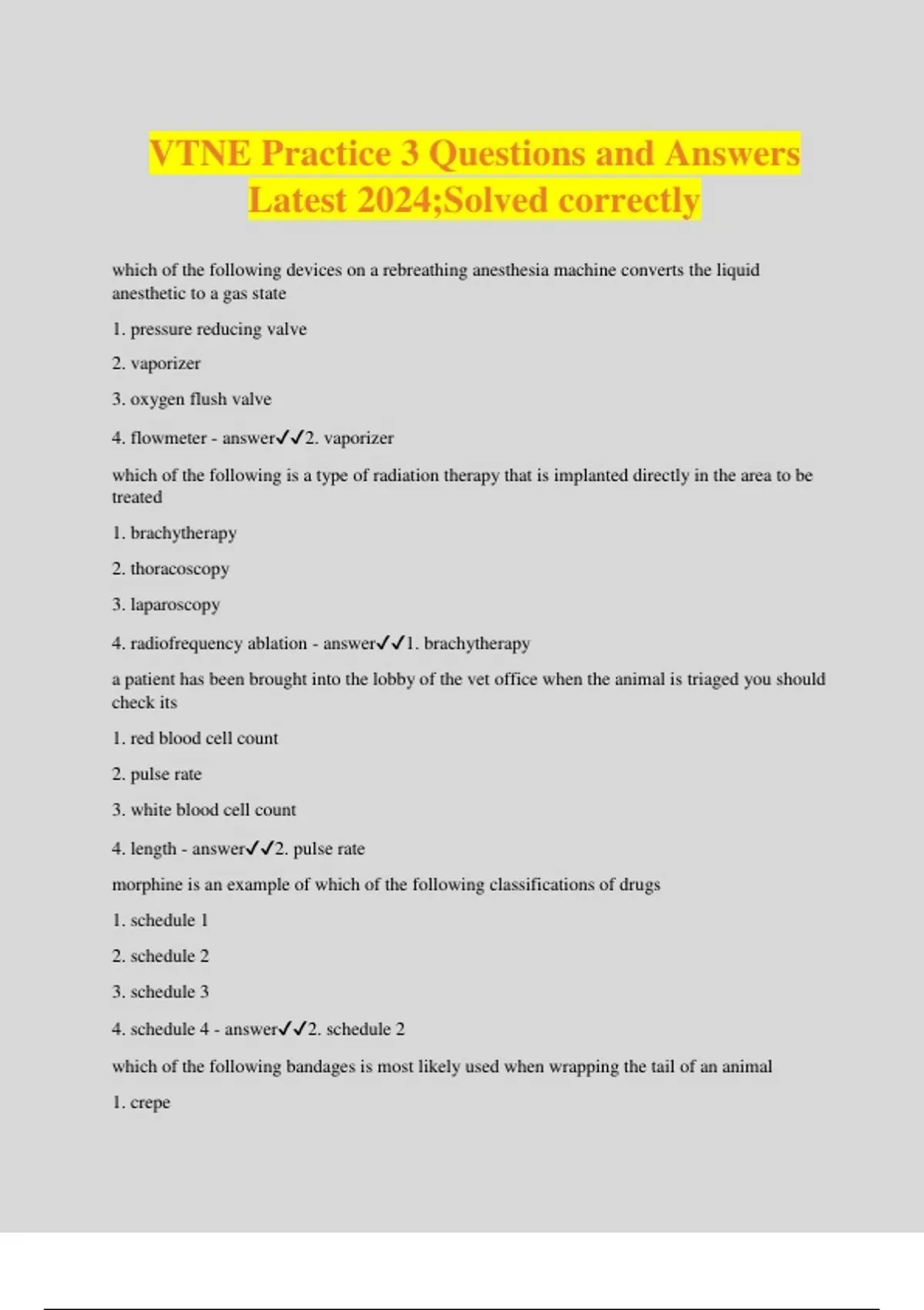 VTNE Practice 3 Questions and Answers Latest 2024;Solved correctly which of the following devices on a rebreathing anesthesia machine converts the liquid anesthetic to a gas state 1. pressure reducing valve 2. vaporizer 3. oxygen flush valve 4. flowmeter - answer2. vaporizer which of the following is a type of radiation therapy that is implanted directly in the area to be treated 1. brachytherapy 2. thoracoscopy 3. laparoscopy 4. radiofrequency ablation - answer1. brachytherapy a patient has been brought into the lobby of the vet office when the animal is triaged you should check its 1. red blood cell count 2. pulse rate 3. white blood cell count 4. length - answer2. pulse rate morphine is an example of which of the following classifications of drugs 1. schedule 1 2. schedule 2 3. schedule 3 4. schedule 4 - answer2. schedule 2 which of the following bandages is most likely used when wrapping the tail of an animal 1. crepe 2. cohesive 3. tubular 4. open weave - answer3. tubular all the following belong to the triad of anesthesia except 1. analgesia 2. muscle relaxation 3. consciousness 4. narcosis - answer3. consciousness which of the following would be considered biomedical waste 1. plastic that is covered with the blood of a healthy rabbit 2. feces from a cat that is infected with ear mites 3. sponges that are soaked in the saliva of a dog with rabies 4. tissue from a castration on a healthy bovine - answer3. sponges that are soaked in the saliva of a dog with rabies which of the following is a fat soluble vitamin 1. folic acid 2. C 3. biotin 4. E - answer4. E which of the following statements is true regarding anesthesia during the dental prophylaxis 1. anesthesia is only used on large breed dogs during the dental prophylaxis 2. anesthesia is avoided during the dental prophylaxis 3. anesthesia is needed to perform a dental radiograph 4. anesthesia is only used on small animals during the dental prophylaxis - answer3. anesthesia is needed to perform a dental radiograph myelography is the radiographic examination of the 1. nerves 2. heart 3. spinal cord 4. brain - answer3. spinal cord the anesthetist announces that the patients leg has been blocked. this means that the patients leg 1. is unable to receive anesthesia 2. is broken or injured 3. has been operated on 4. has been given a local anesthetic - answer4. has been given a local anesthetic all the following animals develop deciduous teeth except 1. cats 2. dolphins 3. sharks 4. cattle - answer2. dolphins which of the following is an examp