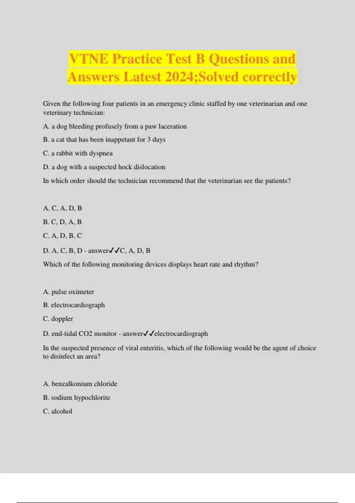 VTNE Practice Test B Questions and Answers Latest 2024;Solved correctly Given the following four patients in an emergency clinic staffed by one veterinarian and one veterinary technician: A. a dog bleeding profusely from a paw laceration B. a cat that has been inappetant for 3 days C. a rabbit with dyspnea D. a dog with a suspected hock dislocation In which order should the technician recommend that the veterinarian see the patients? A. C, A, D, B B. C, D, A, B C. A, D, B, C D. A, C, B, D - answerC, A, D, B Which of the following monitoring devices displays heart rate and rhythm? A. pulse oximeter B. electrocardiograph C. doppler D. end-tidal CO2 monitor - answerelectrocardiograph In the suspected presence of viral enteritis, which of the following would be the agent of choice to disinfect an area? A. benzalkonium chloride B. sodium hypochlorite C. alcohol D. ammonia - answersodium hypochlorite Which of the following drugs is injected sublingually to stimulate breathing of neonates after delivery by cesarean section? A. meperidine B. droperidol C. diazepam D. doxapram - answerdoxapram The osmotic pressure of body fluids is primarily maintained by which of the following ions? A. magnesium B. potassium C. chloride D. sodium - answersodium Dystocia caused by uterine inertia is commonly treated with: A. estrogen B. oxytocin C. progesterone D. prostaglandins - answeroxytocin If a patient has a WBC count of 10,000/uL showing 30% monocytes and 70% lymphocytes, the patient's absolute monocyte count is: A. 30 cells/uL B. 300 cells/uL C. 3,000 cells/uL D. 30,000 cells/uL - answer3,000 cells/uL One characteristic of dissociative anesthesia is: A. decreased muscle tone B. poor somatic analgesia C. poor visceral analgesia D. decreased salivation - answerpoor visceral analgesia Which of the following conversions is most accurate? A. 1 fl oz = 30 ml B. 1 inch = 5 cm C. 60 lb = 100 kg D. 1 tbsp = 4 ml - answer1 fl oz = 30 ml The part of the mature tooth that is contin