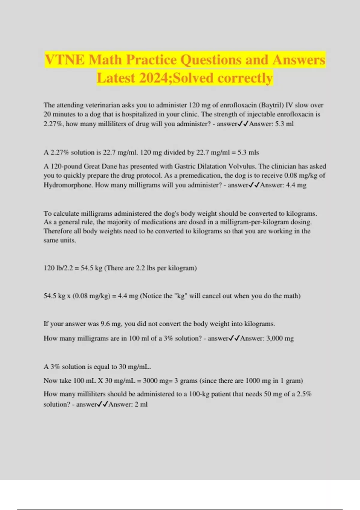 VTNE Math Practice Questions and Answers Latest 2024;Solved correctly The attending veterinarian asks you to administer 120 mg of enrofloxacin (Baytril) IV slow over 20 minutes to a dog that is hospitalized in your clinic. The strength of injectable enrofloxacin is 2.27%, how many milliliters of drug will you administer? - answerAnswer: 5.3 ml A 2.27% solution is 22.7 mg/ml. 120 mg divided by 22.7 mg/ml = 5.3 mls A 120-pound Great Dane has presented with Gastric Dilatation Volvulus. The clinician has asked you to quickly prepare the drug protocol. As a premedication, the dog is to receive 0.08 mg/kg of Hydromorphone. How many milligrams will you administer? - answerAnswer: 4.4 mg To calculate milligrams administered the dog's body weight should be converted to kilograms. As a general rule, the majority of medications are dosed in a milligram-per-kilogram dosing. Therefore all body weights need to be converted to kilograms so that you are working in the same units. 120 lb/2.2 = 54.5 kg (There are 2.2 lbs per kilogram) 54.5 kg x (0.08 mg/kg) = 4.4 mg (Notice the "kg" will cancel out when you do the math) If your answer was 9.6 mg, you did not convert the body weight into kilograms. How many milligrams are in 100 ml of a 3% solution? - answerAnswer: 3,000 mg A 3% solution is equal to 30 mg/mL. Now take 100 mL X 30 mg/mL = 3000 mg= 3 grams (since there are 1000 mg in 1 gram) How many milliliters should be administered to a 100-kg patient that needs 50 mg of a 2.5% solution? - answerAnswer: 2 ml Percent is equal to weight (in Grams) / 100 parts volume (in mLs) (This is based on water since 1 mL weighs 1 Gram): Example: A 3% solution: 3 Grams / 100 mL or 3000 mg / 100 mL or 30 mg/mL The easiest way to remember is to just add a zero onto any percentage for the milligrams (i.e. 2% solution = 20 mg/ml; 10% solution = 100 mg/ml, etc.) In this situation a 2.5% solution is equivalent to 25 mg/ml. Therefore: 50 mg / (25 mg/ml) = 2 ml A 4-kg puppy is in need of subcutaneous fluids due to dehydration. The doctor prescribed a dose of 20 ml/kg. How many milliliters should this patient receive? - answerAnswer: 80 ml To obtain the answer the following math should have been performed: 4 kg x (20 ml/kg) = 80 ml Notice the kilograms were canceled out. A dog presents with a history of coughing and rapid breathing. Radiographs confirm congestive heart failure (see image). You are asked to administer 2 mg/kg of furosemide IV. The concentration of furosemide is 50 mg/mL. The dog weighs 25 pounds. How many milliliters should you administer to this patient? - answerAnswer: 0.44 mL The dog is 25 pounds. 25 pounds/2.2 pounds per kg= 11.3 kg Now multiply the dog's weight in kg by the dose you need (2mg/kg): 11kg X 2mg = 22 mg The dog needs 22 mg. Now divide this dose by the concentration of furosemide (50 mg/mL): 22mg/ 50 = 0.44 mL You are instructed to administer 12 liters of sterile isotonic IV fluids via a fluid pump over the next 24 hours. What is the appropriate fluid rate to administer this volume of IV fluids? - answerAnswer: 500 mL/hour 12 liters (12000 mLs) divided by 24 hours would equal 500 mLs/hour. A 12 pound dog comes into the clinic with a history of vomiting for the last 24 hours. The doctor asks you to give an injection of Cerenia (maropitant) at a dose of 0.45mg/lb. Cerenia has a concentration of 10mg/ml. How many milliliters will be given to the dog? - answerAnswer: 0.54 mls (12lb) X (0.45mg/lb)=5.4mg (lbs cancel) 5.4mg divided by 10mg/ml=0.54mls (the milligrams cancel) A 60-kg dog needs to be sedated with dexmedetomidine and butorphanol. The doctor would like a dose of 10 ug/kg for dexmedetomidine and 0.1 mg/kg for butorphanol. Dexmedetomidine comes in a 1 mg/ml solution, and butorphanol is in a 10 mg/ml solution. How many milliliters of each medication will need to be admi