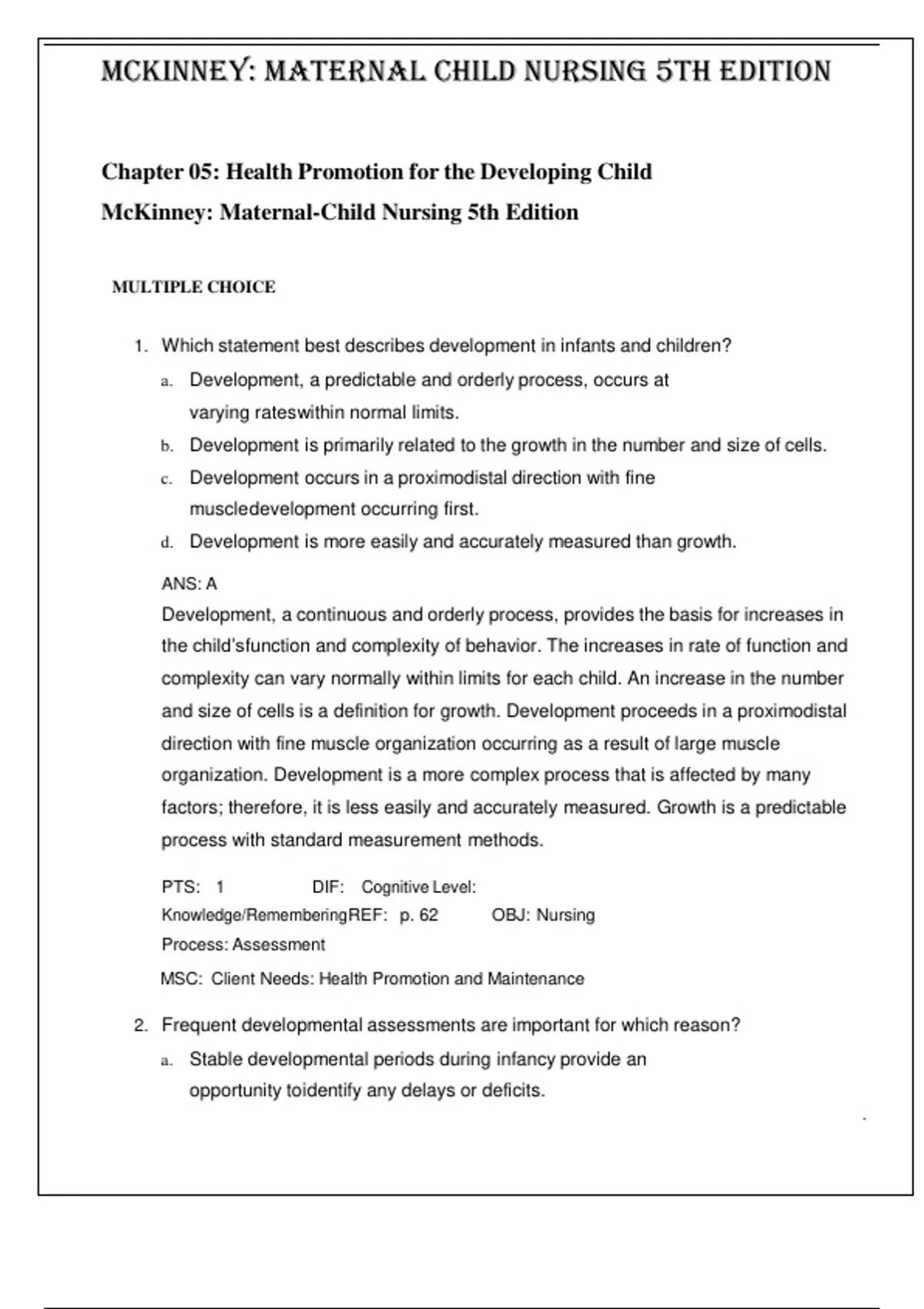 Maternal Child Nursing 5th Edition by McKinney- ISBN- 978-0323401708 TEST BANK Chapter 05: Health Promotion for the Developing Child Verified 2024 Practice Questions and 100% Correct Answers with Explanations for Exam Preparation, Graded A+ 1. Which statement best describes development in infants and children? a. Development, a predictable and orderly process, occurs at varying rateswithin normal limits. b. Development is primarily related to the growth in the number and size of cells. c. Development occurs in a proximodistal direction with fine muscledevelopment occurring first. d. Development is more easily and accurately measured than growth. ANS: A Development, a continuous and orderly process, provides the basis for increases in the child’sfunction and complexity of behavior. The increases in rate of function and complexity can vary normally within limits for each child. An increase in the number and size of cells is a definition for growth. Development proceeds in a proximodistal direction with fine muscle organization occurring as a result of large muscle organization. Development is a more complex process that is affected by many factors; therefore, it is less easily and accurately measured. Growth is a predictable process with standard measurement methods. PTS: 1 DIF: Cognitive Level: Knowledge/RememberingREF: p. 62 OBJ: Nursing Process: Assessment MSC: Client Needs: Health Promotion and Maintenance 2. Frequent developmental assessments are important for which reason? a. Stable developmental periods during infancy provide an opportunity toidentify any delays or deficits. . b. Infants need stimulation specific to the stage of development. c. Critical periods of development occur during childhood. d. Child development is unpredictable and needs monitoring. ANS: C Critical periods are blocks of time during which children are ready to master specific developmental tasks. The earlier those delays in development are discovered and interventioninitiated, the less dramatic their effect will be. Infancy is a dynamic time of development thatrequires frequent evaluations to assess appropriate developmental progress. Infants in a nurturing environment will develop appropriately and will not necessarily need stimulation specific to their developmental stage. Normal growth and development is orderly and proceeds in a predictable pattern based on each individual’s abilities and potentials. PTS: 1 DIF: Cognitive Level: Comprehension/UnderstandingREF: p. 64 OBJ: Nursing Process: Assessment MSC: Client Needs: Health Promotion and Maintenance