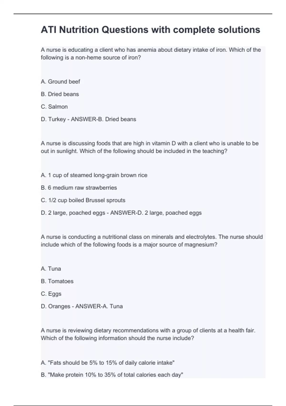 nurse is educating a client who has anemia about dietary intake of iron. Which of the following is a non-heme source of iron? A. Ground beef B. Dried beans C. Salmon D. Turkey - ANSWER-B. Dried beans A nurse is discussing foods that are high in vitamin D with a client who is unable to be out in sunlight. Which of the following should be included in the teaching? A. 1 cup of steamed long-grain brown rice B. 6 medium raw strawberries C. 1/2 cup boiled Brussel sprouts D. 2 large, poached eggs - ANSWER-D. 2 large, poached eggs A nurse is conducting a nutritional class on minerals and electrolytes. The nurse should include which of the following foods is a major source of magnesium? A. Tuna B. Tomatoes C. Eggs D. Oranges - ANSWER-A. Tuna A nurse is reviewing dietary recommendations with a group of clients at a health fair. Which of the following information should the nurse include? A. "Fats should be 5% to 15% of daily calorie intake" B. "Make protein 10% to 35% of total calories each day" C. " Consume 1,500 mL of water from liquids and solids daily" D. "The body needs 40 mg of iron each day" - ANSWER-B. "Make protein 10% to 35% of total calories each day"